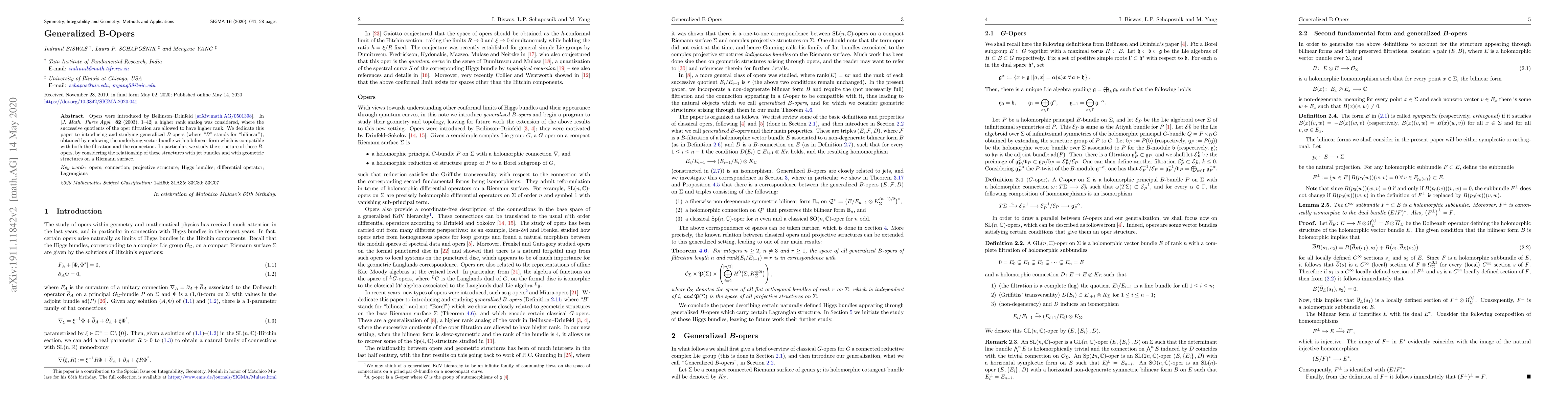 Opers were introduced by Beilinson-Drinfeld [arXiv:math.AG/0501398]. In [J. Math. Pures Appl. 82 (2003), 1-42] a higher rank analog was considered, where the successive quotients of the oper filtration are allowed to have higher rank. We dedicate this paper to introducing and studying generalized $B$-opers (where "$B$" stands for "bilinear"), obtained by endowing the underlying vector bundle with a bilinear form which is compatible with both the filtration and the connection. In particular, we study the structure of these $B$-opers, by considering the relationship of these structures with jet bundles and with geometric structures on a Riemann surface.