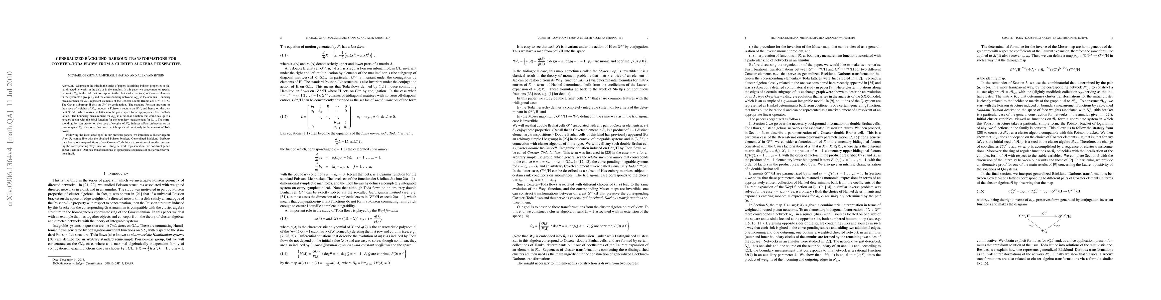 We present the third in the series of papers describing Poisson properties of planar directed networks in the disk or in the annulus. In this paper we concentrate on special networks N_{u,v} in the disk that correspond to the choice of a pair (u,v) of Coxeter elements in the symmetric group and the corresponding networks N_{u,v}^\circ in the annulus. Boundary measurements for N_{u,v} represent elements of the Coxeter double Bruhat cell G^{u,v} in GL_n. The Cartan subgroup acts on G^{u,v} by conjugation. The standard Poisson structure on the space of weights of N_{u,v} induces a Poisson structure on G^{u,v}, and hence on its quotient by the Cartan subgroup, which makes the latter into the phase space for an appropriate Coxeter--Toda lattice. The boundary measurement for N_{u,v}^\circ is a rational function that coincides up to a nonzero factor with the Weyl function for the boundary measurement for N_{u,v}. The corresponding Poisson bracket on the space of weights of N_{u,v}^\circ induces a Poisson bracket on the certain space of rational functions, which appeared previously in the context of Toda flows. Following the ideas developed in our previous papers, we introduce a cluster algebra A on this space, compatible with the obtained Poisson bracket. Generalized B\"acklund--Darboux transformations map solutions of one Coxeter--Toda lattice to solutions of another preserving the corresponding Weyl function. Using network representation, we construct generalized B\"acklund-Darboux transformations as appropriate sequences of cluster transformations in A.