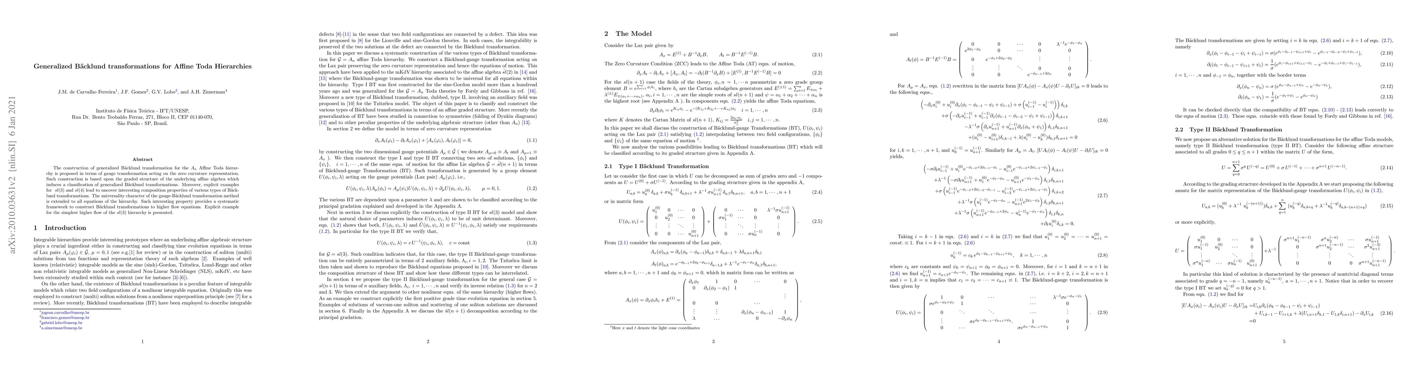 The construction of generalized Backlund transformation for the $A_n$ Affine Toda hierarchy is proposed in terms of gauge transformation acting on the zero curvature representation. Such construction is based upon the graded structure of the underlying affine algebra which induces a classification of generalized Backlund transformations. Moreover, explicit examples for $su(3)$ and $su(4)$ lead to uncover interesting composition properties of various types of Backlund transformations. The universality character of the gauge-Backlund transformation method is extended to all equations of the hierarchy. Such interesting property provides a systematic framework to construct Backlund transformations to higher flow equations. Explicit example for the simplest higher flow of the $sl(3)$ hierarchy is presented.