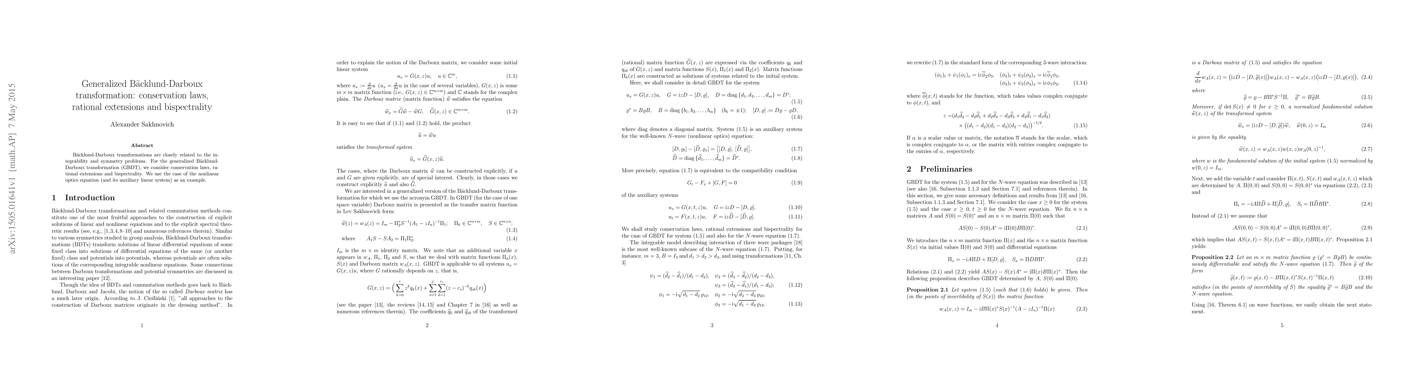 Baecklund-Darboux transformations are closely related to the integrability and symmetry problems. For the generalized Baecklund-Darboux transformation (GBDT), we consider conservation laws, rational extensions and bispectrality. We use the case of the nonlinear optics equation (and its auxiliary linear system) as an example.