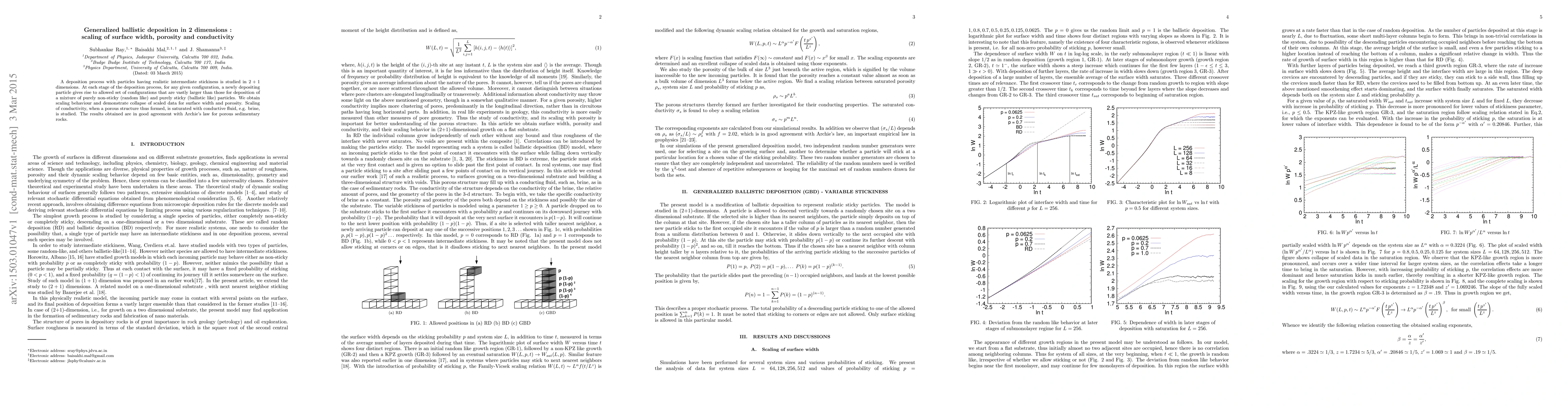 This paper investigates a generalized ballistic deposition process in 2+1 dimensions, focusing on the scaling behavior of surface width, porosity, and conductivity. The study reveals that the intermediate stickiness of particles results in a larger set of allowed configurations compared to purely non-sticky or sticky particles. The findings demonstrate scaling and data collapse for surface width and porosity, and the conductivity scaling aligns well with Archie's law for porous rocks.