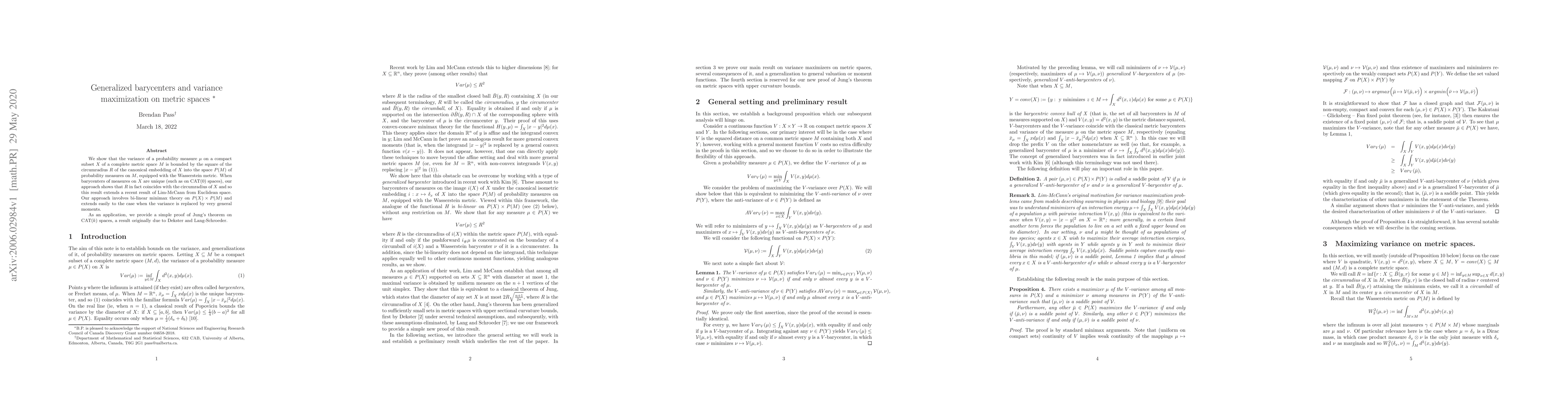We show that the variance of a probability measure $\mu$ on a compact subset $X$ of a complete metric space $M$ is bounded by the square of the circumradius $R$ of the canonical embedding of $X$ into the space $P(M)$ of probability measures on $M$, equipped with the Wasserstein metric. When barycenters of measures on $X$ are unique (such as on CAT($0$) spaces), our approach shows that $R$ in fact coincides with the circumradius of $X$ and so this result extends a recent result of Lim-McCann from Euclidean space. Our approach involves bi-linear minimax theory on $P(X) \times P(M)$ and extends easily to the case when the variance is replaced by very general moments. As an application, we provide a simple proof of Jung's theorem on CAT($k$) spaces, a result originally due to Dekster and Lang-Schroeder.