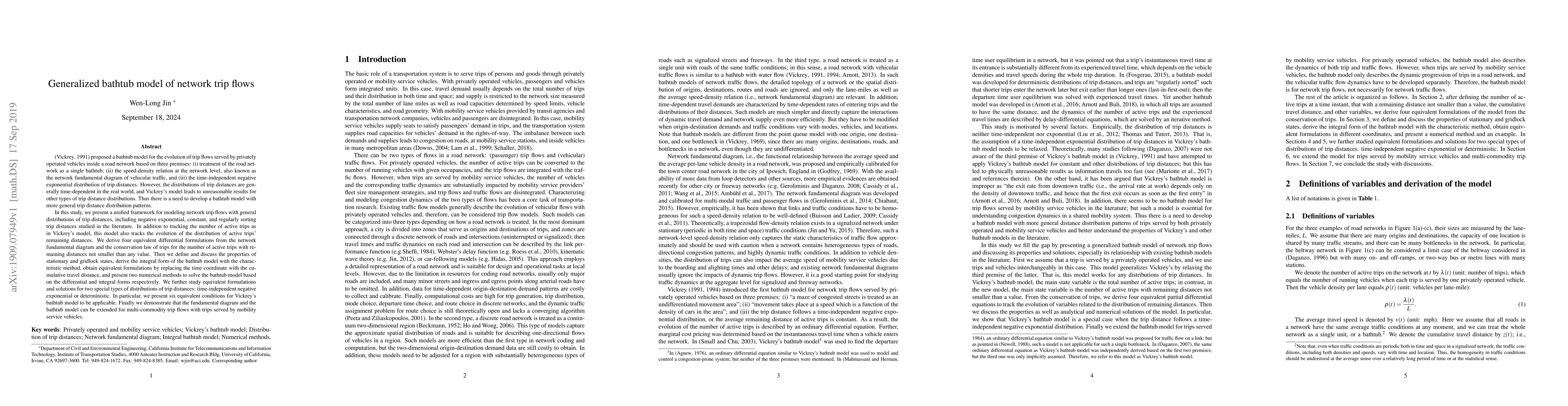 In this study, we present a unified framework for modeling network trip flows with general distributions of trip distances, including negative exponential, constant, and regularly sorting trip distances studied in the literature. In addition to tracking the number of active trips as in Vickrey's model, this model also tracks the evolution of the distribution of active trips' remaining distances. We derive four equivalent differential formulations from the network fundamental diagram and the conservation law of trips for the number of active trips with remaining distances not smaller than any value. Then we define and discuss the properties of stationary and gridlock states, derive the integral form of the bathtub model with the characteristic method, obtain equivalent formulations by replacing the time coordinate with the cumulative travel distance, and present two numerical methods to solve the bathtub model based on the differential and integral forms respectively. We further study equivalent formulations and solutions for two special types of distributions of trip distances: time-independent negative exponential or deterministic. In particular, we present six equivalent conditions for Vickrey's bathtub model to be applicable. Finally we demonstrate that the fundamental diagram and the bathtub model can be extended for multi-commodity trip flows with trips served by mobility service vehicles.