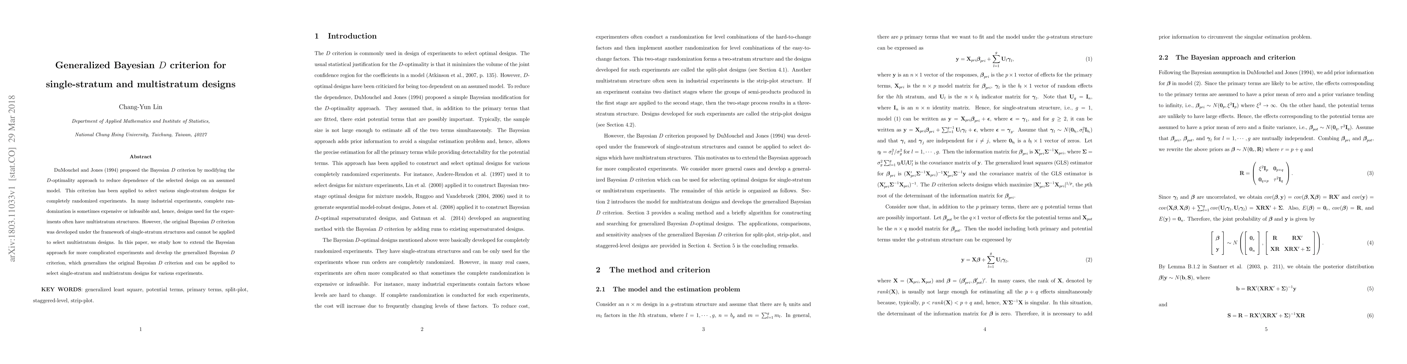 This paper extends the Bayesian D criterion to generalize its applicability for both single-stratum and multistratum experimental designs, addressing the limitations of the original criterion which only applied to single-stratum structures. The generalized Bayesian D criterion is developed to select designs when the number of effects exceeds the rank of the model matrix.