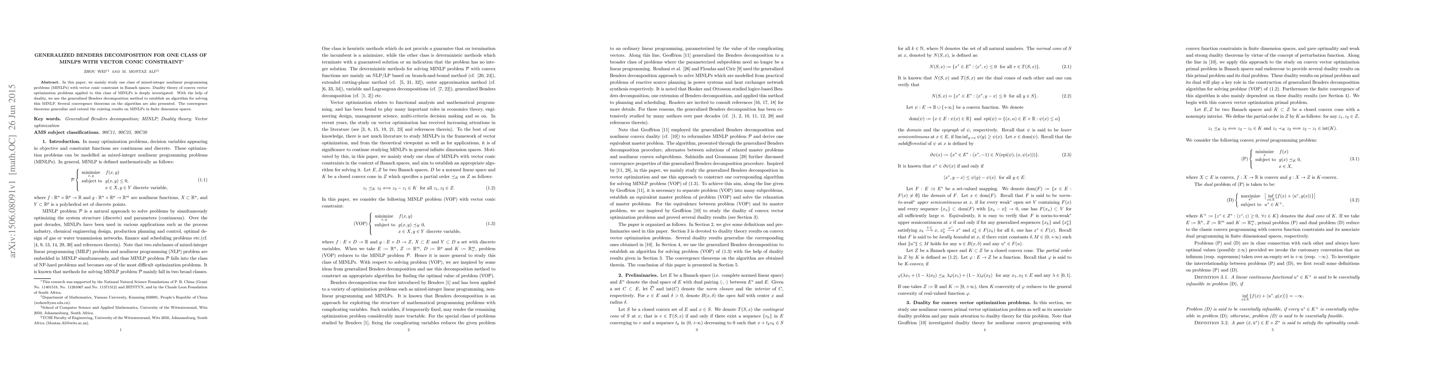 This paper investigates mixed-integer nonlinear programming problems (MINLPs) with vector conic constraints in Banach spaces, applying duality theory to develop a generalized Benders decomposition algorithm. The study presents convergence theorems that extend existing results for MINLPs in finite dimensions.