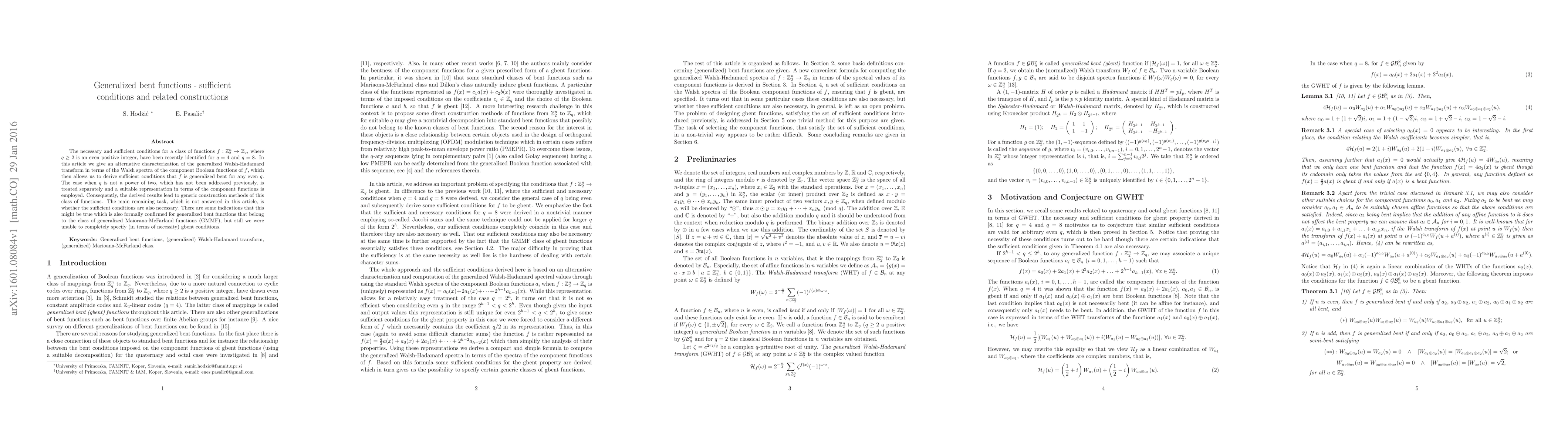 The necessary and sufficient conditions for a class of functions $f:\mathbb{Z}_2^n \rightarrow \mathbb{Z}_q$, where $q \geq 2$ is an even positive integer, have been recently identified for $q=4$ and $q=8$. In this article we give an alternative characterization of the generalized Walsh-Hadamard transform in terms of the Walsh spectra of the component Boolean functions of $f$, which then allows us to derive sufficient conditions that $f$ is generalized bent for any even $q$. The case when $q$ is not a power of two, which has not been addressed previously, is treated separately and a suitable representation in terms of the component functions is employed. Consequently, the derived results lead to generic construction methods of this class of functions. The main remaining task, which is not answered in this article, is whether the sufficient conditions are also necessary. There are some indications that this might be true which is also formally confirmed for generalized bent functions that belong to the class of generalized Maiorana-McFarland functions (GMMF), but still we were unable to completely specify (in terms of necessity) gbent conditions.