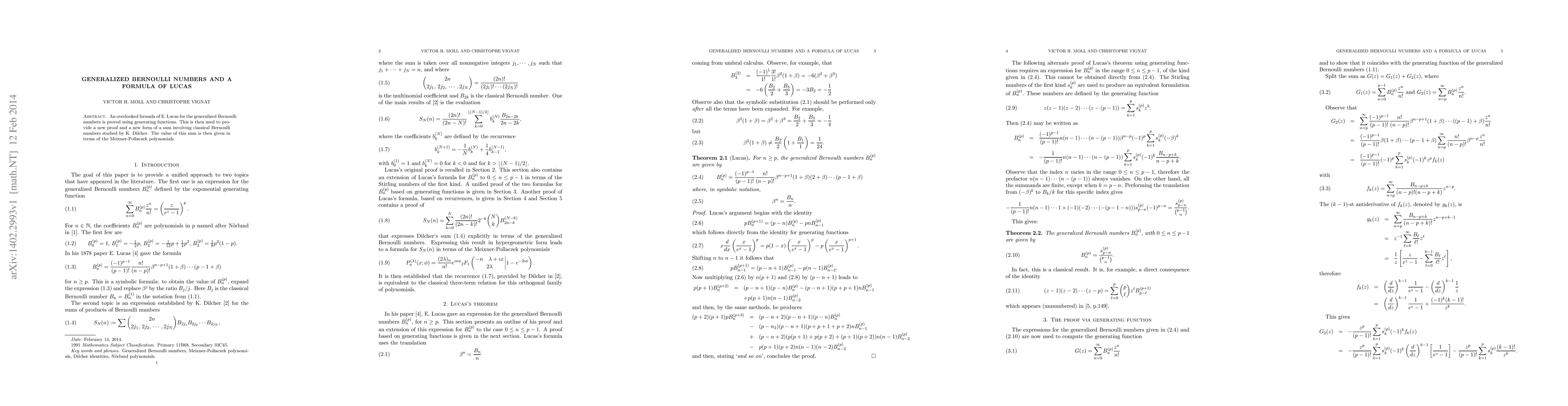 An overlooked formula of E. Lucas for the generalized Bernoulli numbers is proved using generating functions. This is then used to provide a new proof and a new form of a sum involving classical Bernoulli numbers studied by K. Dilcher. The value of this sum is then given in terms of the Meixner-Pollaczek polynomials.