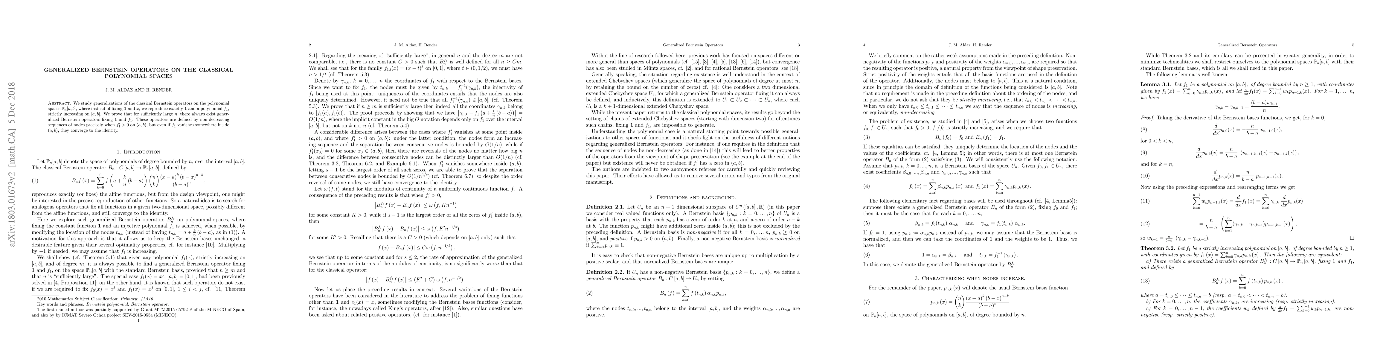 This paper explores generalized Bernstein operators on polynomial spaces, focusing on fixing $\mathbf{1}$ and a strictly increasing polynomial $f_1$ instead of just $\mathbf{1}$ and $x$. It demonstrates diverse behaviors through examples and proves the existence and convergence of these operators to the identity for large dimensions.