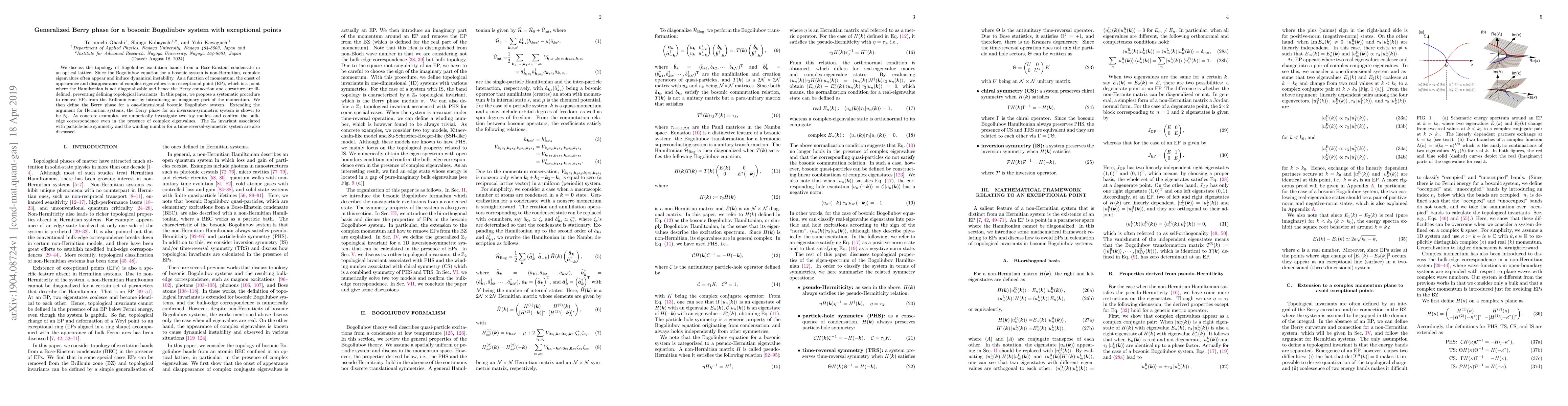 We discuss the topology of Bogoliubov excitation bands from a Bose-Einstein condensate in an optical lattice. Since the Bogoliubov equation for a bosonic system is non-Hermitian, complex eigenvalues often appear and induce dynamical instability. As a function of momentum, the onset of appearance and disappearance of complex eigenvalues is an exceptional point (EP), which is a point where the Hamiltonian is not diagonalizable and hence the Berry connection and curvature are ill-defined, preventing defining topological invariants. In this paper, we propose a systematic procedure to remove EPs from the Brillouin zone by introducing an imaginary part of the momentum. We then define the Berry phase for a one-dimensional bosonic Bogoliubov system. Extending the argument for Hermitian systems, the Berry phase for an inversion-symmetric system is shown to be $Z_2$. As concrete examples, we numerically investigate two toy models and confirm the bulk-edge correspondence even in the presence of complex eigenvalues. The $Z_2$ invariant associated with particle-hole symmetry and the winding number for a time-reversal-symmetric system are also discussed.
