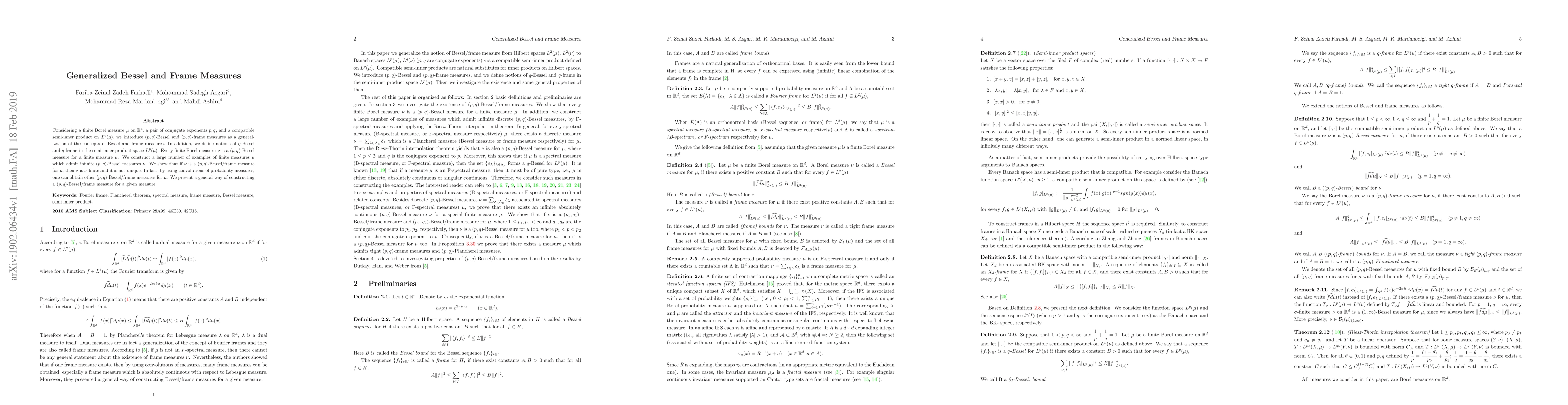 This paper generalizes the concepts of Bessel and frame measures in the context of a finite Borel measure on $ \mathbb{R}^d $, introducing $(p,q)$-Bessel and $(p,q)$-frame measures. It also defines $q$-Bessel and $q$-frame measures within a semi-inner product space $L^p(\mu)$ and demonstrates that any finite Borel measure $\nu$ can serve as a $(p,q)$-Bessel measure for $\mu$, with non-uniqueness and construction via convolutions of probability measures.