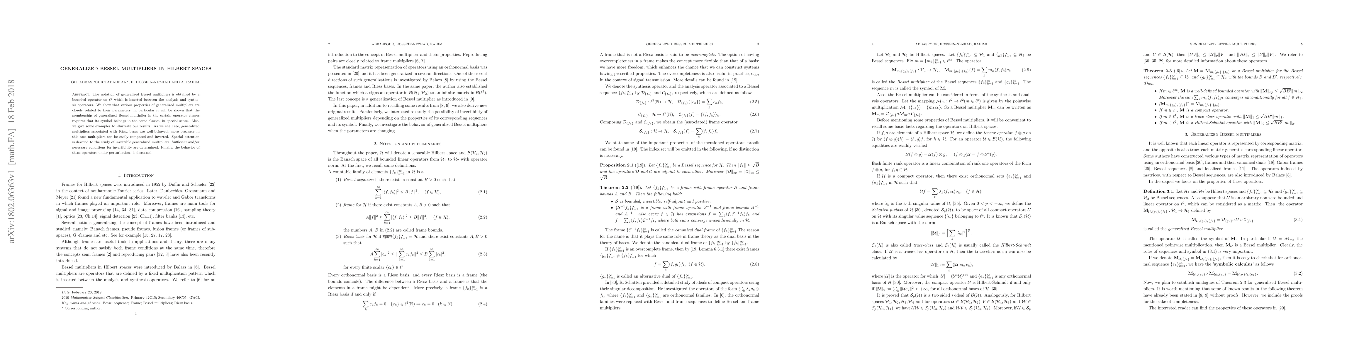 This paper explores properties of generalized Bessel multipliers in Hilbert spaces, showing how their behavior is closely tied to their parameters and illustrating examples for Riesz bases. It also examines conditions for invertibility and the impact of perturbations on these operators.