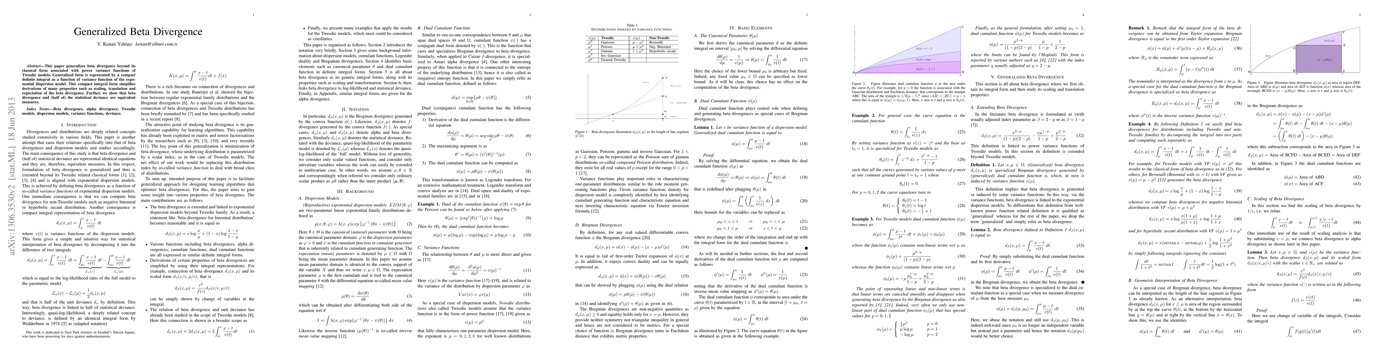 This paper generalizes beta divergence beyond its classical form associated with power variance functions of Tweedie models. Generalized form is represented by a compact definite integral as a function of variance function of the exponential dispersion model. This compact integral form simplifies derivations of many properties such as scaling, translation and expectation of the beta divergence. Further, we show that beta divergence and (half of) the statistical deviance are equivalent measures.