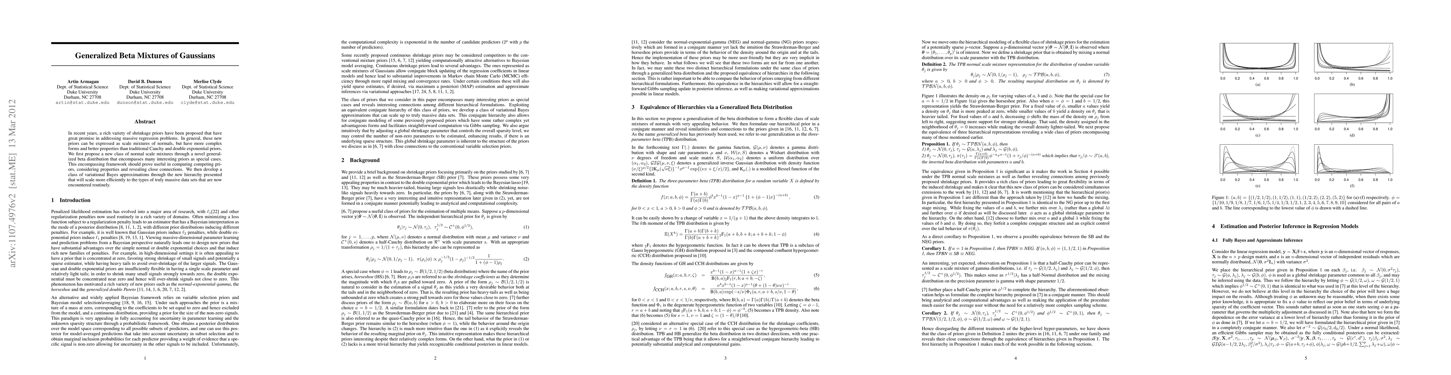 In recent years, a rich variety of shrinkage priors have been proposed that have great promise in addressing massive regression problems. In general, these new priors can be expressed as scale mixtures of normals, but have more complex forms and better properties than traditional Cauchy and double exponential priors. We first propose a new class of normal scale mixtures through a novel generalized beta distribution that encompasses many interesting priors as special cases. This encompassing framework should prove useful in comparing competing priors, considering properties and revealing close connections. We then develop a class of variational Bayes approximations through the new hierarchy presented that will scale more efficiently to the types of truly massive data sets that are now encountered routinely.