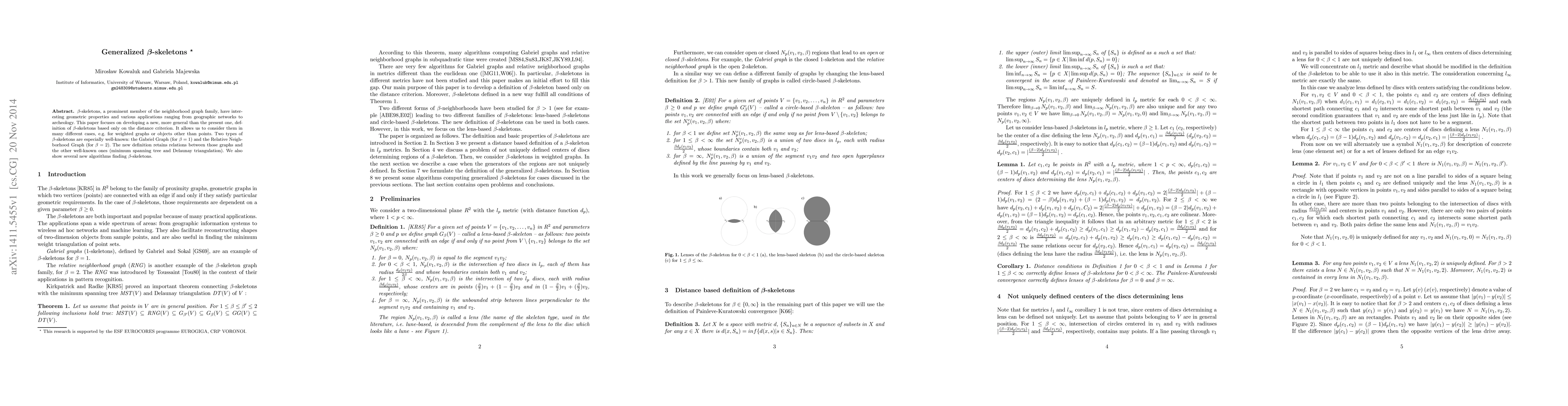 This paper introduces a generalized definition of $\beta$-skeletons based solely on distance criteria, extending their applicability to weighted graphs and non-point objects. It retains connections to known graphs like Gabriel and Relative Neighborhood Graphs, and presents new algorithms for finding $\beta$-skeletons.