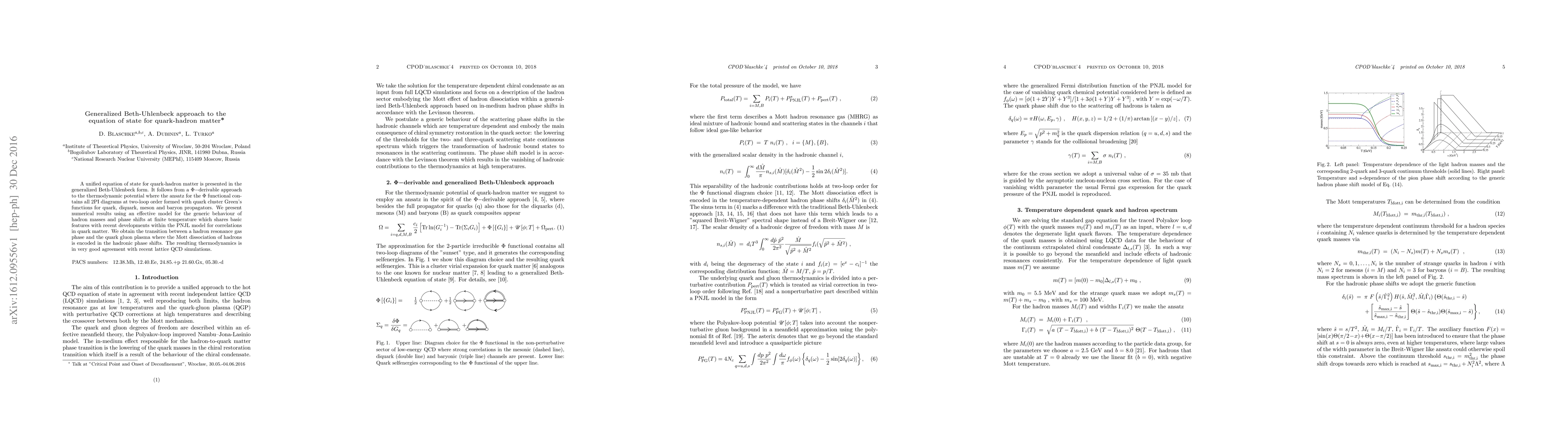 A unified equation of state for quark-hadron matter is presented in the generalized Beth-Uhlenbeck form. It follows from a $\Phi-$derivable approach to the thermodynamic potential where the ansatz for the $\Phi$ functional contains all 2PI diagrams at two-loop order formed with quark cluster Green's functions for quark, diquark, meson and baryon propagators. We present numerical results using an effective model for the generic behaviour of hadron masses and phase shifts at finite temperature which shares basic features with recent developments within the PNJL model for correlations in quark matter. We obtain the transition between a hadron resonance gas phase and the quark gluon plasma where the Mott dissociation of hadrons is encoded in the hadronic phase shifts. The resulting thermodynamics is in very good agreement with recent lattice QCD simulations.