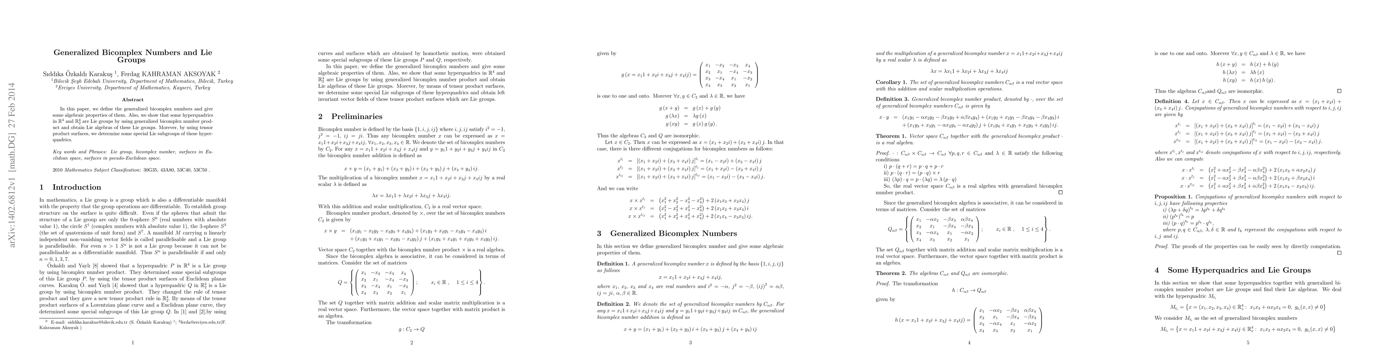 This paper introduces generalized bicomplex numbers and explores their algebraic properties. It demonstrates that certain hyperquadrics in R⁴ and R⁴² are Lie groups, derives their Lie algebras using the generalized bicomplex number product, and identifies special Lie subgroups via tensor product surfaces.