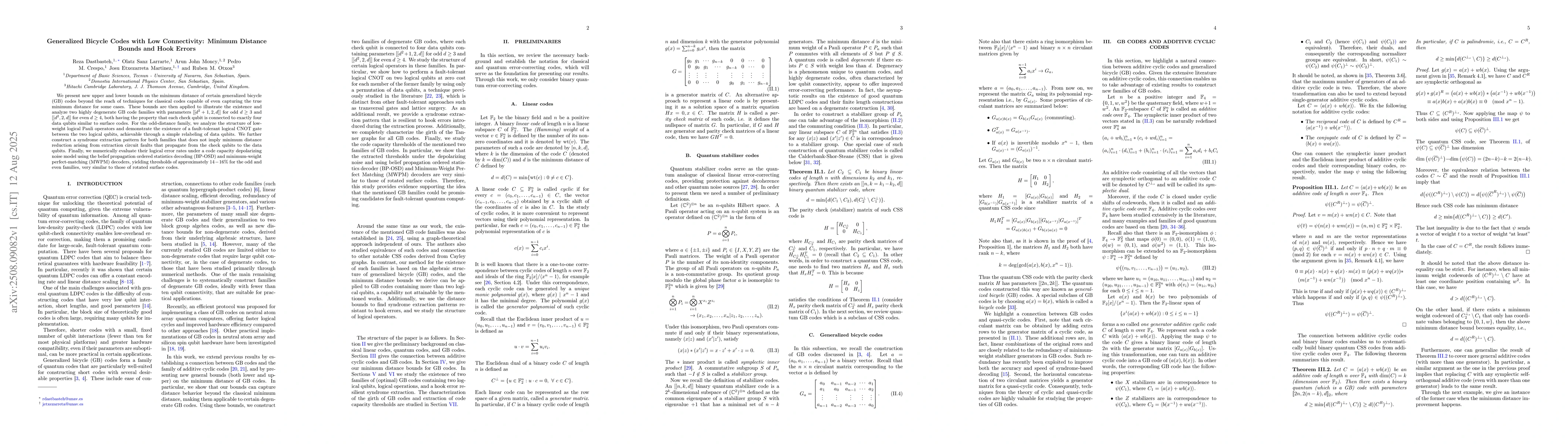 We present new upper and lower bounds on the minimum distance of certain generalized bicycle (GB) codes beyond the reach of techniques for classical codes capable of even capturing the true minimum distance for some cases. These bounds are then applied to illustrate the existence and analyze two highly degenerate GB code families with parameters $[[d^2+1,2,d]]$ for odd $d \geq 3$ and $[[d^2,2,d]]$ for even $d \geq 4$, both having the property that each check qubit is connected to exactly four data qubits similar to surface codes. For the odd-distance family, we analyze the structure of low-weight logical Pauli operators and demonstrate the existence of a fault-tolerant logical CNOT gate between the two logical qubits, achievable through a simple relabeling of data qubits. We further construct a syndrome extraction pattern for both families that does not imply minimum distance reduction arising from extraction circuit faults that propagate from the check qubits to the data qubits. Finally, we numerically evaluate their logical error rates under a code capacity depolarizing noise model using the belief propagation ordered statistics decoding (BP-OSD) and minimum-weight perfect-matching (MWPM) decoders, yielding thresholds of approximately $14-16\%$ for the odd and even families, very similar to those of rotated surface codes.