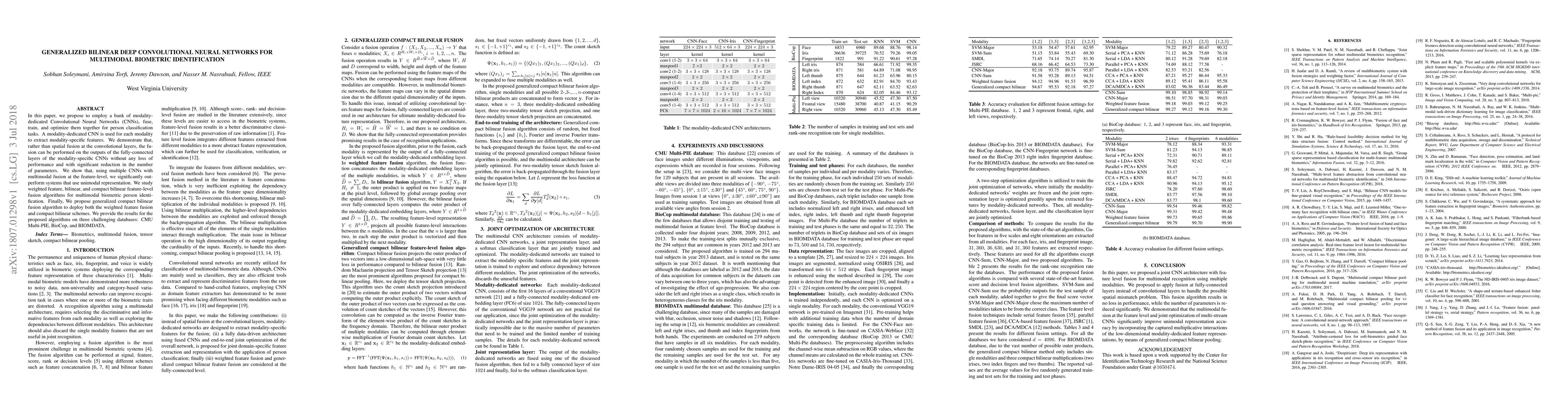 This paper proposes a generalized bilinear deep convolutional neural network for multimodal biometric identification, employing modality-specific CNNs and optimizing them together for person classification. It demonstrates effective feature-level fusion at the fully-connected layer outputs, significantly reducing parameters while maintaining performance.