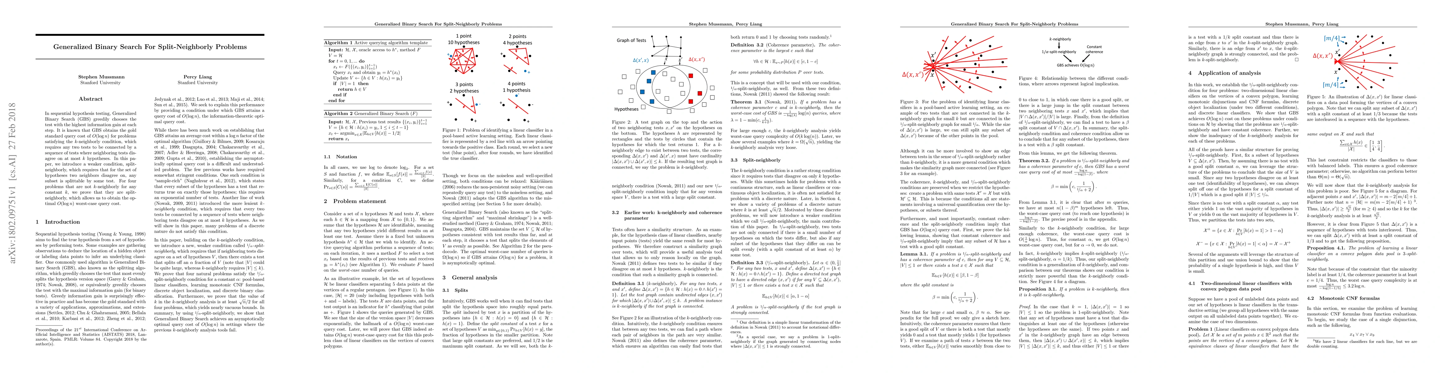 In sequential hypothesis testing, Generalized Binary Search (GBS) greedily chooses the test with the highest information gain at each step. It is known that GBS obtains the gold standard query cost of $O(\log n)$ for problems satisfying the $k$-neighborly condition, which requires any two tests to be connected by a sequence of tests where neighboring tests disagree on at most $k$ hypotheses. In this paper, we introduce a weaker condition, split-neighborly, which requires that for the set of hypotheses two neighbors disagree on, any subset is splittable by some test. For four problems that are not $k$-neighborly for any constant $k$, we prove that they are split-neighborly, which allows us to obtain the optimal $O(\log n)$ worst-case query cost.