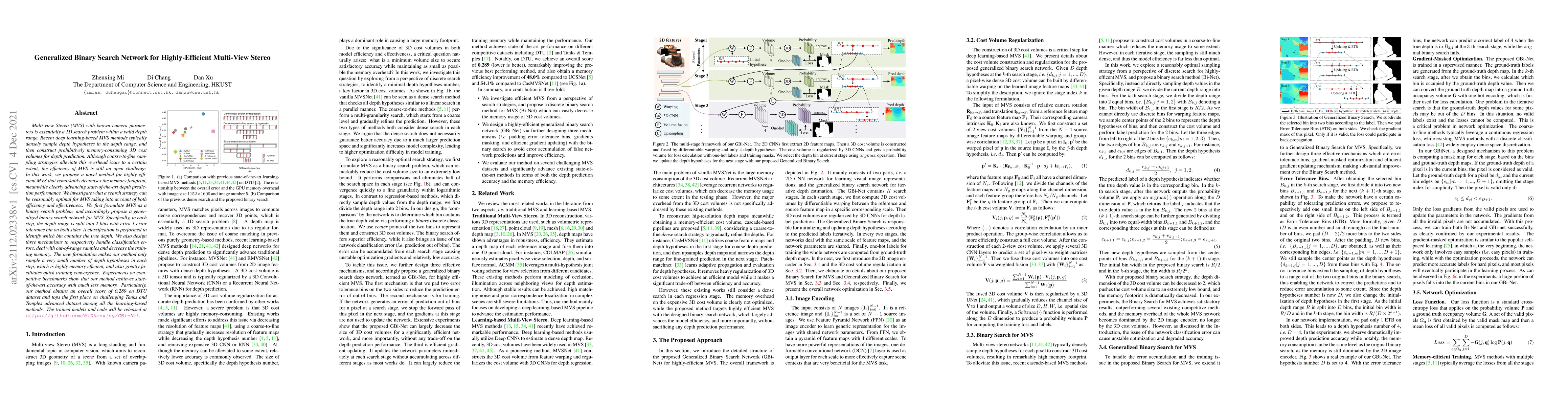 This paper proposes a Generalized Binary Search Network for highly efficient Multi-View Stereo (MVS) that significantly reduces memory usage while achieving state-of-the-art depth prediction accuracy. The method formulates MVS as a binary search problem, splitting the depth range into bins and performing classification to identify the true depth, which leads to minimal sampling and quick training convergence.