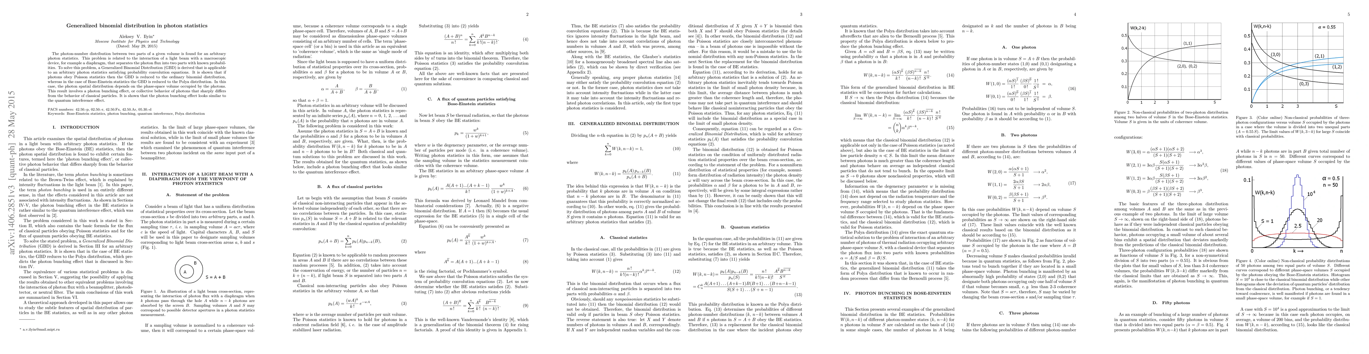 This research derives a Generalized Binomial Distribution (GBD) for photon statistics in any arbitrary distribution, applicable via probability convolution equations. It shows that Poisson statistics reduce GBD to binomial, and Bose-Einstein to Polya. Photon bunching, a collective behavior, is linked to quantum interference, with spatial distribution depending on occupied phase-space volume.