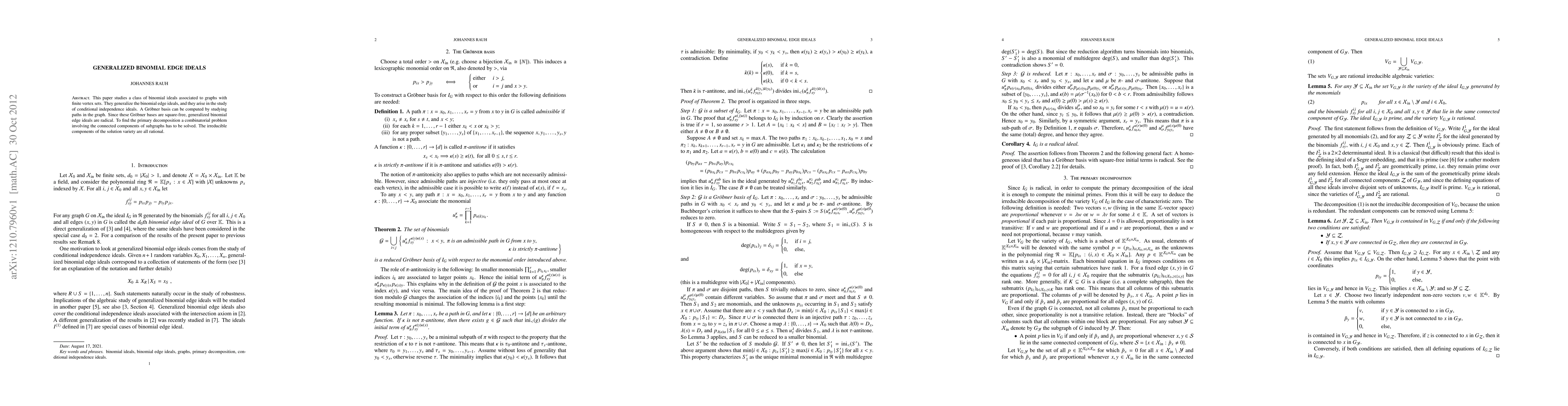 This paper studies a class of binomial ideals associated to graphs with finite vertex sets. They generalize the binomial edge ideals, and they arise in the study of conditional independence ideals. A Gr\"obner basis can be computed by studying paths in the graph. Since these Gr\"obner bases are square-free, generalized binomial edge ideals are radical. To find the primary decomposition a combinatorial problem involving the connected components of subgraphs has to be solved. The irreducible components of the solution variety are all rational.