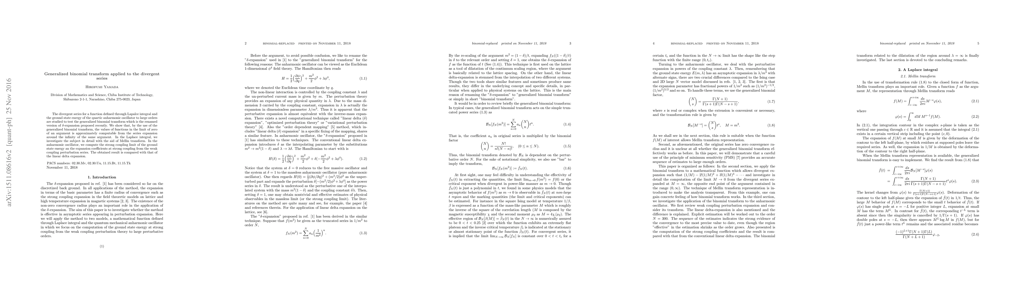The divergent series for a function defined through Lapalce integral and the ground state energy of the quartic anharmonic oscillator to large orders are studied to test the generalized binomial transform which is the renamed version of $\delta$-expansion proposed recently. We show that, by the use of the generalized binomial transform, the values of functions in the limit of zero of an argument is approximately computable from the series expansion around the infinity of the same argument. In the Laplace integral, we investigate the subject in detail with the aid of Mellin transform. In the anharmonic oscillator, we compute the strong coupling limit of the ground state energy and also the expansion coefficients at strong coupling from the weak coupling perturbation series. The obtained result is compared with that of the linear delta expansion.