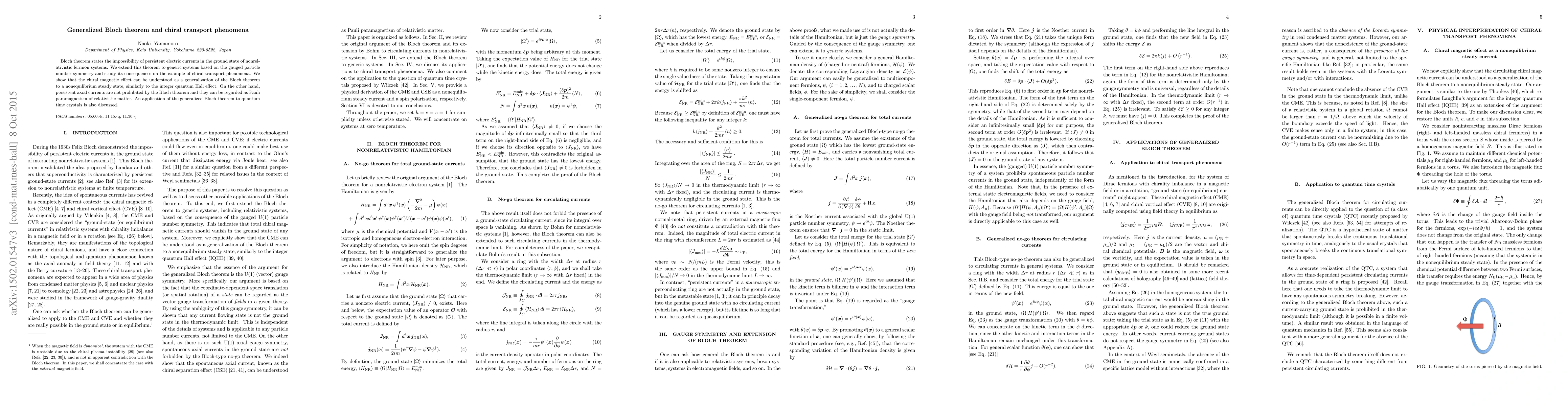 Bloch theorem states the impossibility of persistent electric currents in the ground state of nonrelativistic fermion systems. We extend this theorem to generic systems based on the gauged particle number symmetry and study its consequences on the example of chiral transport phenomena. We show that the chiral magnetic effect can be understood as a generalization of the Bloch theorem to a nonequilibrium steady state, similarly to the integer quantum Hall effect. On the other hand, persistent axial currents are not prohibited by the Bloch theorem and they can be regarded as Pauli paramagnetism of relativistic matter. An application of the generalized Bloch theorem to quantum time crystals is also discussed.