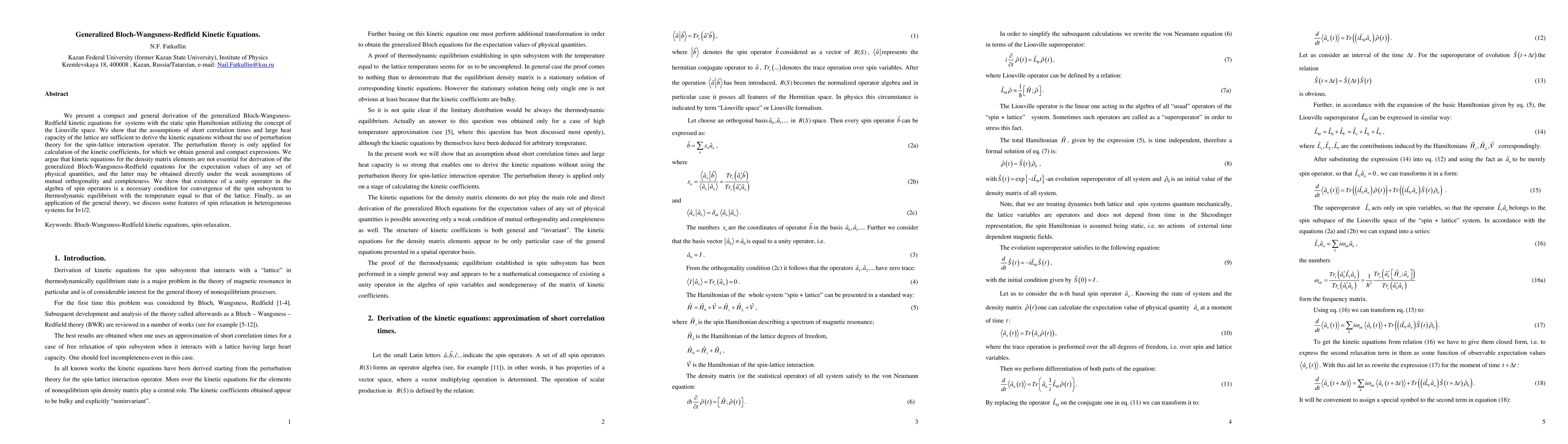 This paper derives generalized Bloch-Wangsness-Redfield kinetic equations for spin systems using Liouville space, without relying on perturbation theory for spin-lattice interaction. It emphasizes that the equations can be derived under weak assumptions, focusing on expectation values rather than density matrix elements.