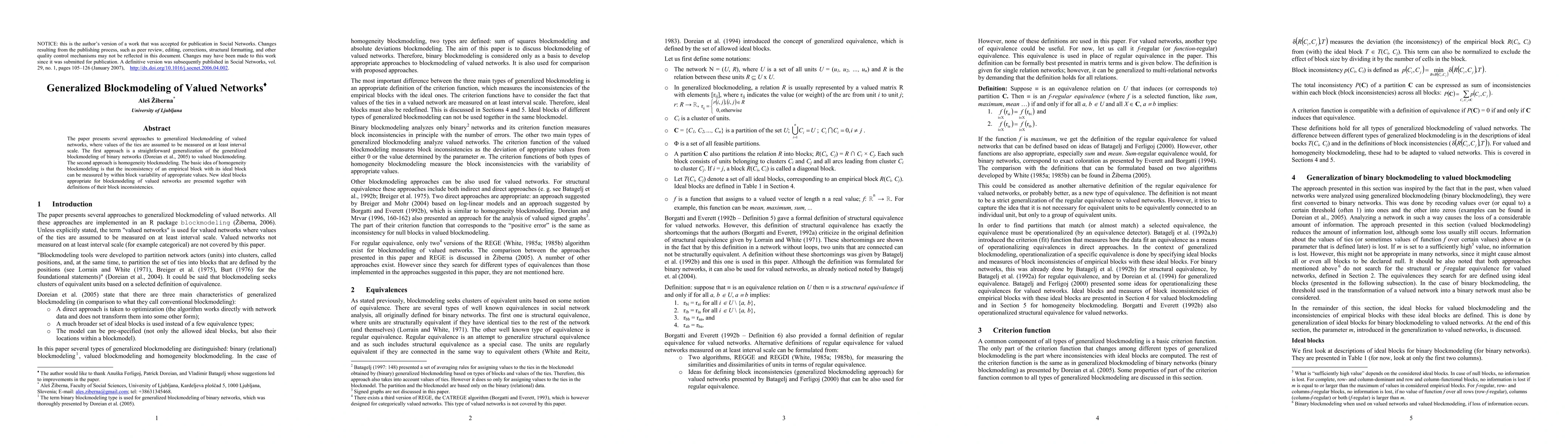 This paper introduces generalized blockmodeling techniques for valued networks, extending binary network methods to interval-scaled tie values. It proposes two approaches: a direct generalization of existing binary blockmodeling and a new homogeneity blockmodeling method, which measures inconsistency based on within-block variability.