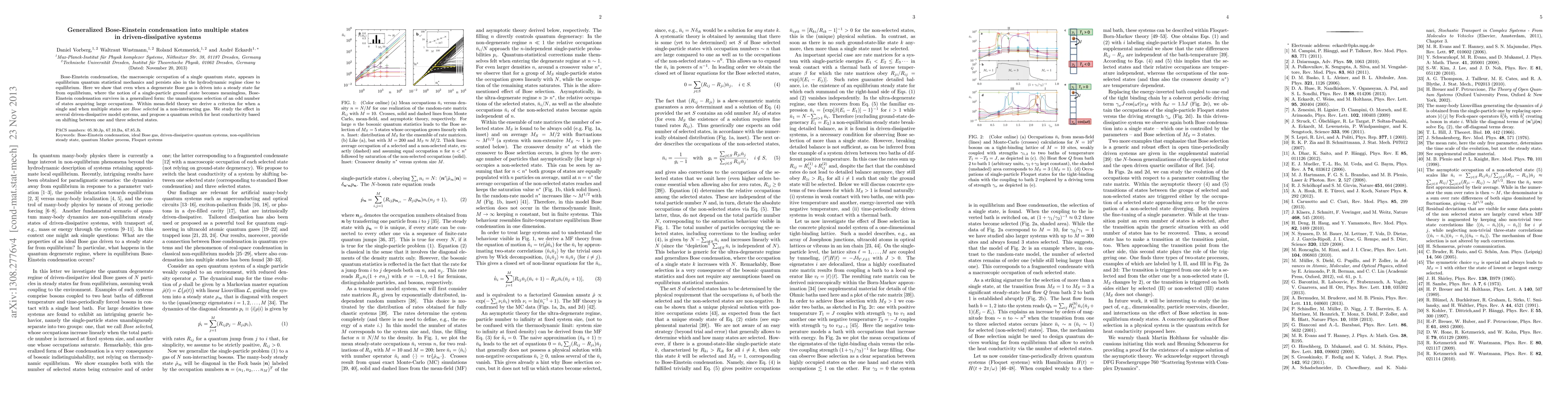 This paper explores generalized Bose-Einstein condensation in driven-dissipative systems far from equilibrium, demonstrating the selection of an odd number of states with large occupations. The authors derive a criterion for single versus multiple state selection in a non-interacting gas and propose a quantum switch for heat conductivity based on state selection.