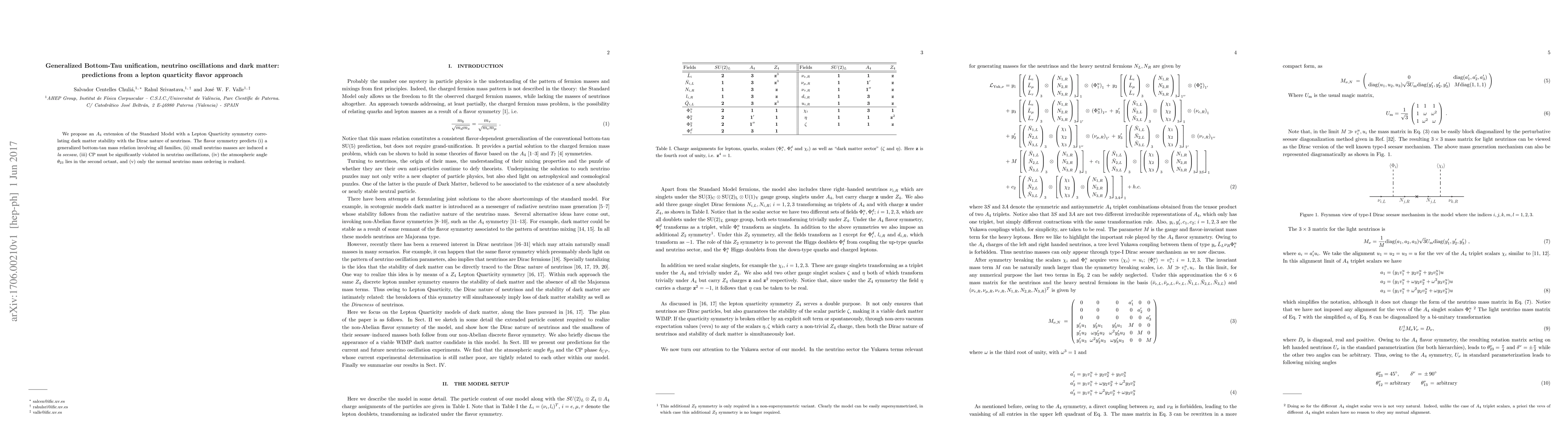 We propose an $A_4$ extension of the Standard Model with a Lepton Quarticity symmetry correlating dark matter stability with the Dirac nature of neutrinos. The flavor symmetry predicts (i) a generalized bottom-tau mass relation involving all families, (ii) small neutrino masses are induced a la seesaw, (iii) CP must be significantly violated in neutrino oscillations, (iv) the atmospheric angle $\theta_{23}$ lies in the second octant, and (v) only the normal neutrino mass ordering is realized.