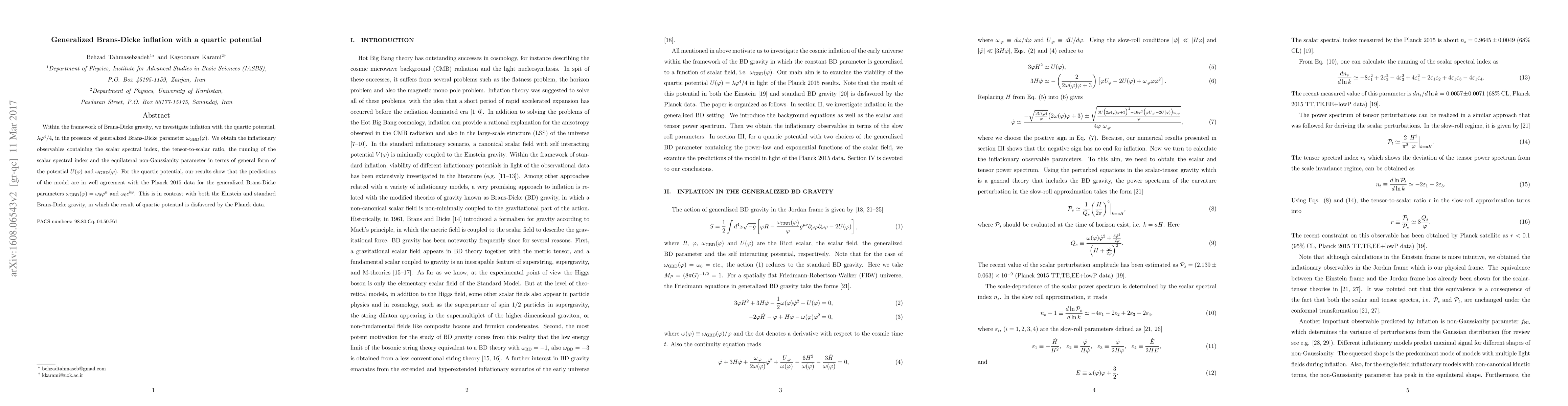 This paper explores Brans-Dicke gravity with a quartic potential for inflation, deriving inflationary observables that align with Planck 2015 data for specific generalized Brans-Dicke parameters, contrasting with the disfavored results in Einstein and standard Brans-Dicke gravity frameworks.