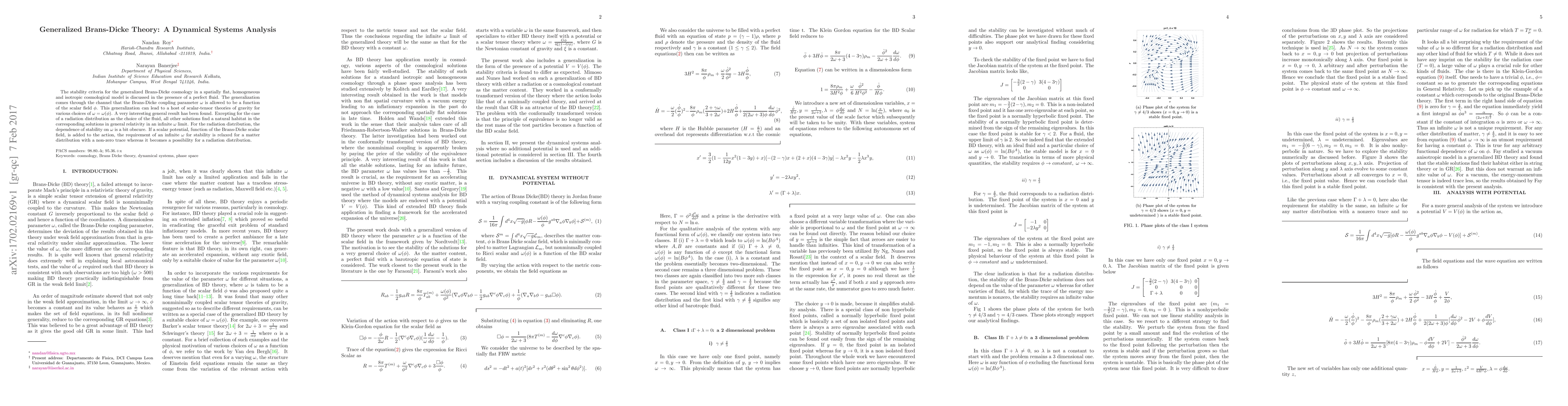 The stability criteria for the generalized Brans-Dicke cosmology in a spatially flat, homogeneous and isotropic cosmological model is discussed in the presence of a perfect fluid. The generalization comes through the channel that the Brans-Dicke coupling parameter $\omega$ is allowed to be a function of the scalar field $\phi$. This generalization can lead to a host of scalar-tensor theories of gravity for various choices of $\omega = \omega (\phi)$. A very interesting general result has been found. Excepting for the case of a radiation distribution as the choice of the fluid, all other solutions find a natural habitat in the corresponding solutions in general relativity in an infinite $\omega$ limit. For the radiation distribution, the dependence of stability on $\omega$ is a bit obscure. If a scalar potential, function of the Brans-Dicke scalar field, is added to the action, the requirement of an infinite $\omega$ for stability is relaxed for a matter distribution with a non-zero trace whereas it becomes a possibility for a radiation distribution.