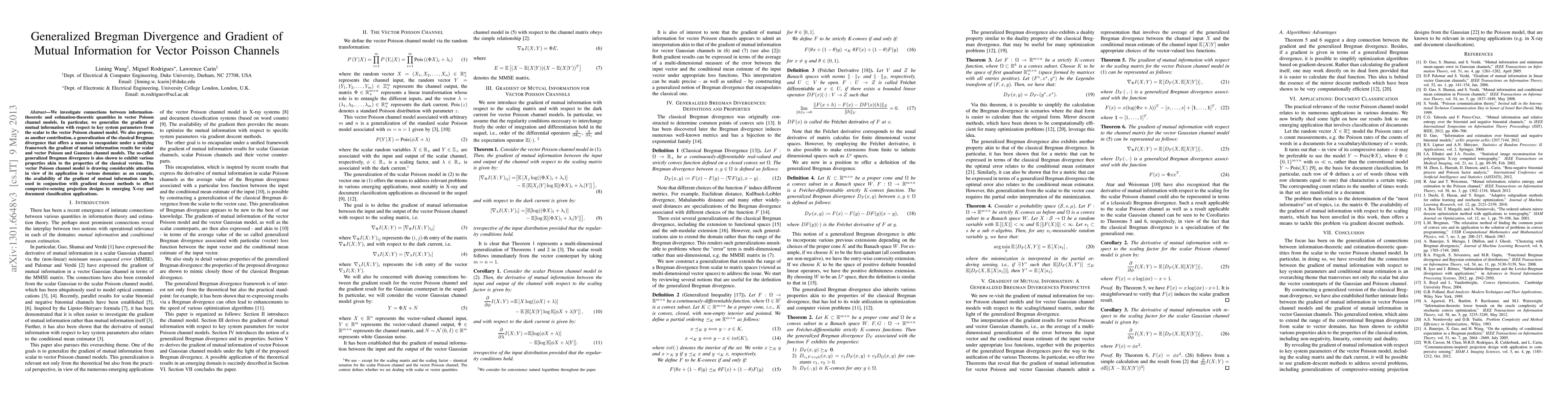 This paper generalizes the gradient of mutual information for vector Poisson channels and proposes a generalized Bregman divergence to unify scalar and vector Poisson and Gaussian channel models. The study highlights applications in compressive-sensing projection designs for emerging X-ray and document classification technologies.