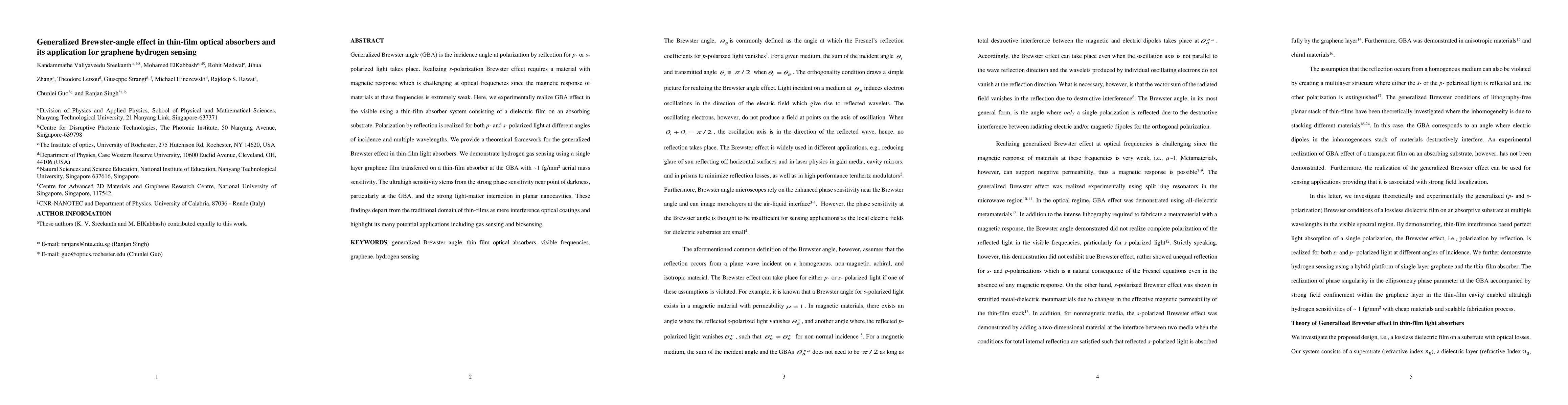 Generalized Brewster angle (GBA) is the incidence angle at which polarization by reflection for p- and s-polarized light takes place. Realizing s-polarization Brewster effect requires a material with magnetic response which is challenging at optical frequencies since the magnetic response of materials at these frequencies is extremely weak. Here, we experimentally realize GBA effect in the visible using a thin-film absorber system consisting of a dielectric film on an absorbing substrate. Polarization by reflection is realized for both p- and s- polarized light at different angles of incidence and multiple wavelengths. We provide a theoretical framework for the generalized Brewster effect in thin-film light absorbers. We demonstrate hydrogen gas sensing using a single layer graphene film transferred on a thin-film absorber at the GBA with ~1 fg/mm2 aerial mass sensitivity. The ultrahigh sensitivity stems from the strong phase sensitivity near point of darkness, particularly at the GBA, and the strong light-matter interaction in planar nanocavities. These findings depart from the traditional domain of thin-films as mere interference optical coatings and highlight its many potential applications including gas sensing and biosensing.