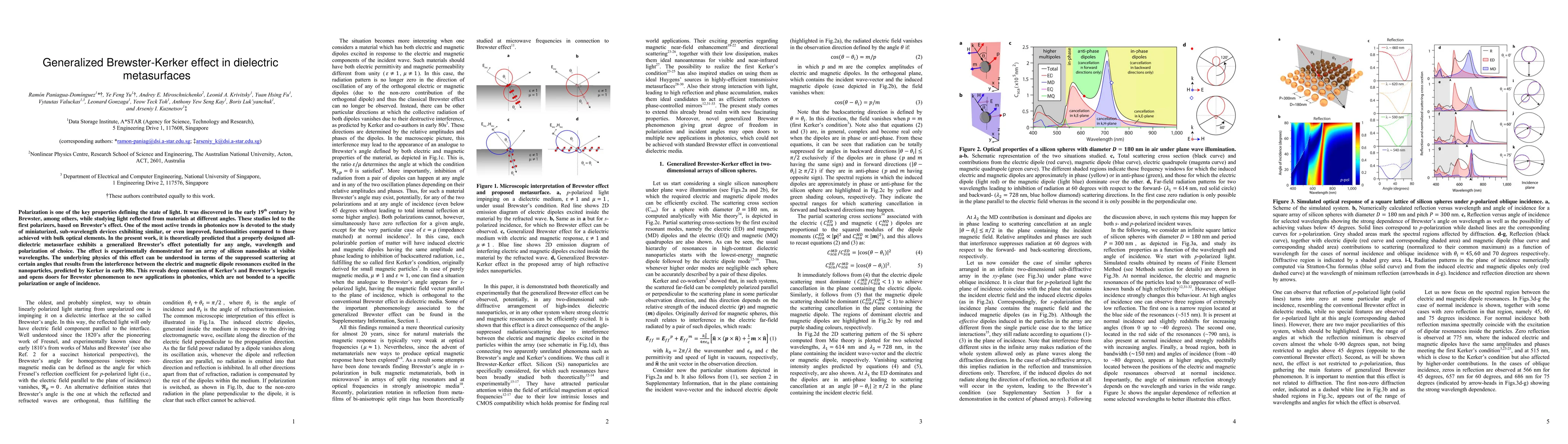 The paper presents a theoretical framework and experimental evidence for a generalized Brewster effect in dielectric metasurfaces, leveraging the interference of electric and magnetic dipole resonances.