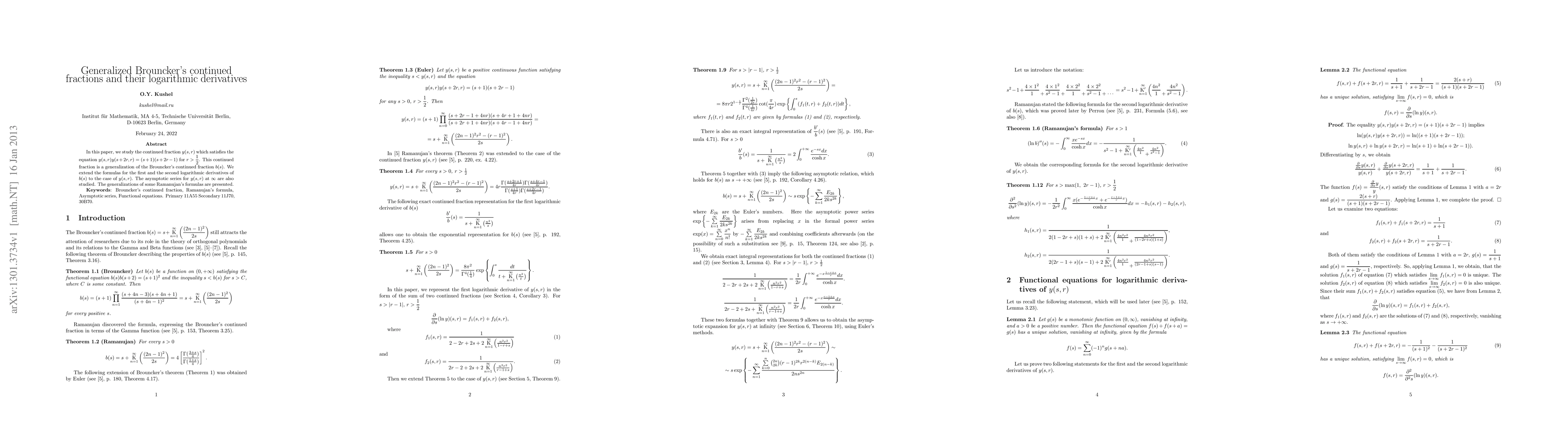 In this paper, we study the continued fraction y(s,r) which satisfies the equation y(s,r)y(s+2r,r)=(s+1)(s+2r-1) for r > 1/2. This continued fraction is a generalization of the Brouncker's continued fraction b(s). We extend the formulas for the first and the second logarithmic derivatives of b(s) to the case of y(s,r). The asymptotic series for y(s,r) at the infinity are also studied. The generalizations of some Ramanujan's formulas are presented.