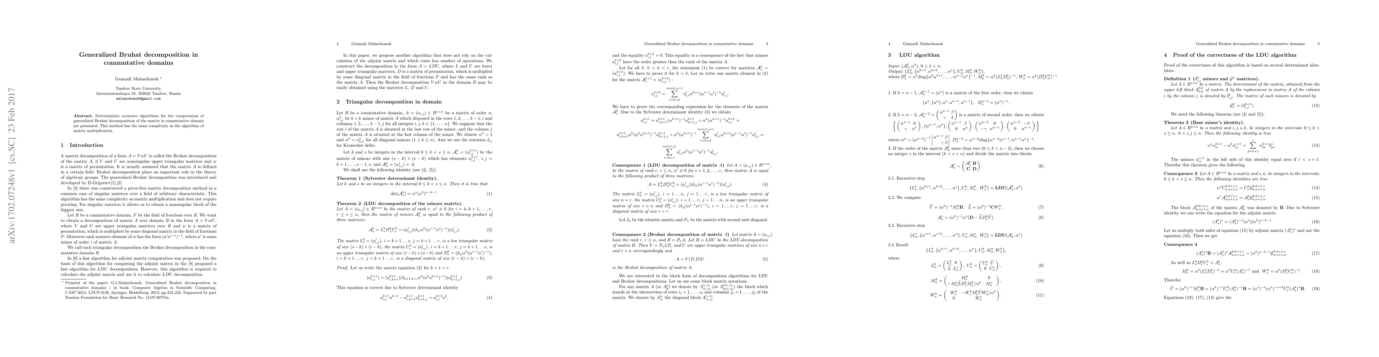 Summary: This paper presents deterministic recursive algorithms for computing generalized Bruhat decomposition in commutative domains, matching the complexity of matrix multiplication. The method is applicable to matrices within these domains.