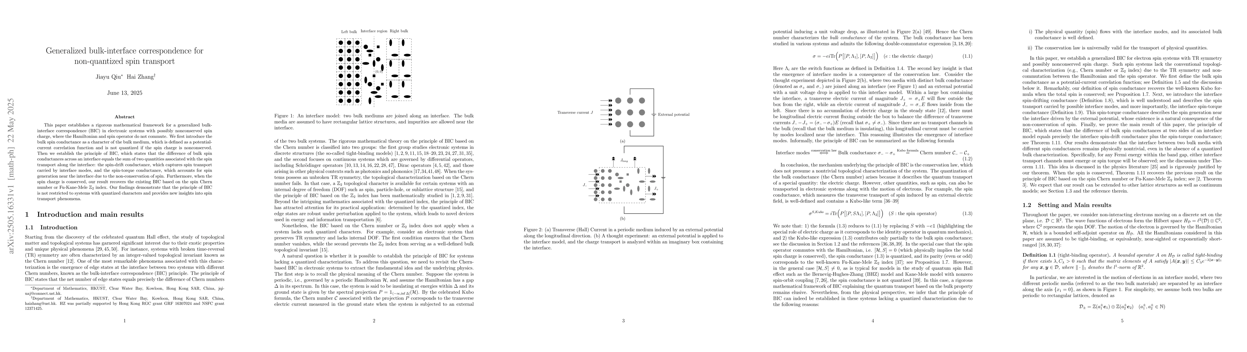 The paper introduces a mathematical framework for generalized bulk-interface correspondence (BIC) in electronic systems with nonconserved spin charge, defining bulk spin conductance as a potential-current correlation function not quantized for nonconserved spin charge.