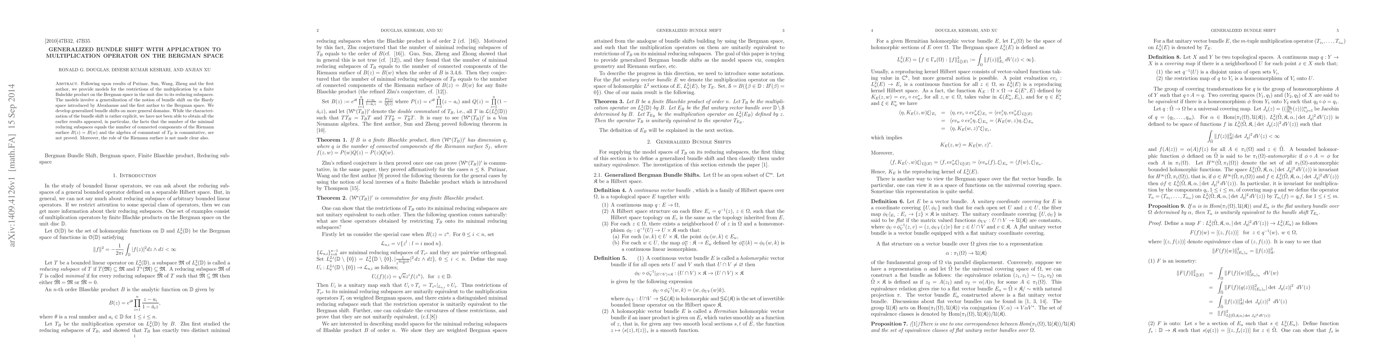 Following upon results of Putinar, Sun, Wang, Zheng and the first author, we provide models for the restrictions of the multiplication by a finite Balschke product on the Bergman space in the unit disc to its reducing subspaces. The models involve a generalization of the notion of bundle shift on the Hardy space introduced by Abrahamse and the first author to the Bergman space. We develop generalized bundle shifts on more general domains. While the characterization of the bundle shift is rather explicit, we have not been able to obtain all the earlier results appeared, in particular, the facts that the number of the minimal reducing subspaces equals the number of connected components of the Riemann surface $B(z)=B(w)$ and the algebra of commutant of $T_{B}$ is commutative, are not proved. Moreover, the role of the Riemann surface is not made clear also.