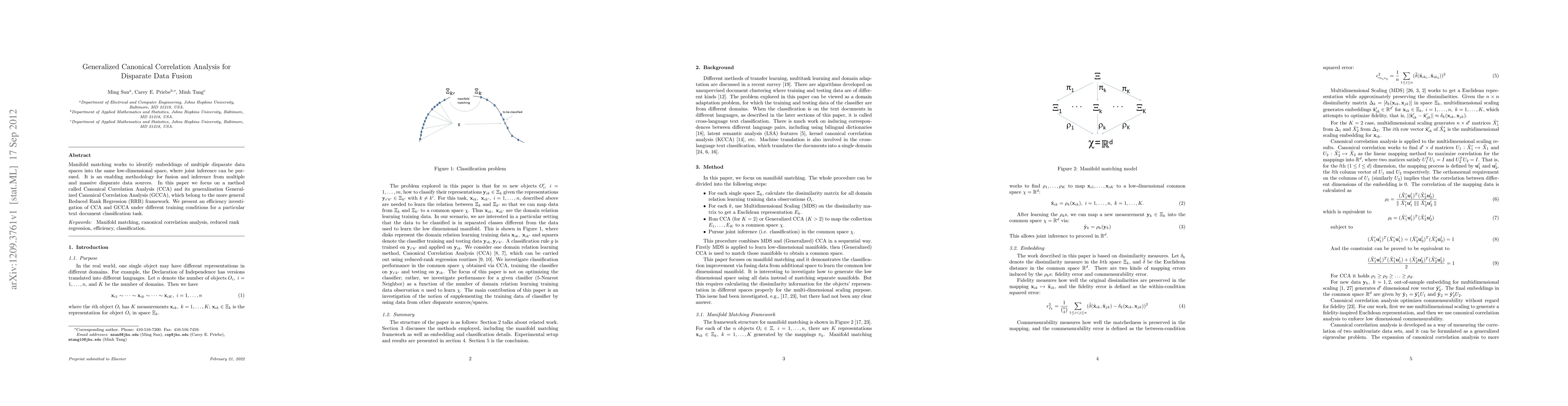 Manifold matching works to identify embeddings of multiple disparate data spaces into the same low-dimensional space, where joint inference can be pursued. It is an enabling methodology for fusion and inference from multiple and massive disparate data sources. In this paper we focus on a method called Canonical Correlation Analysis (CCA) and its generalization Generalized Canonical Correlation Analysis (GCCA), which belong to the more general Reduced Rank Regression (RRR) framework. We present an efficiency investigation of CCA and GCCA under different training conditions for a particular text document classification task.