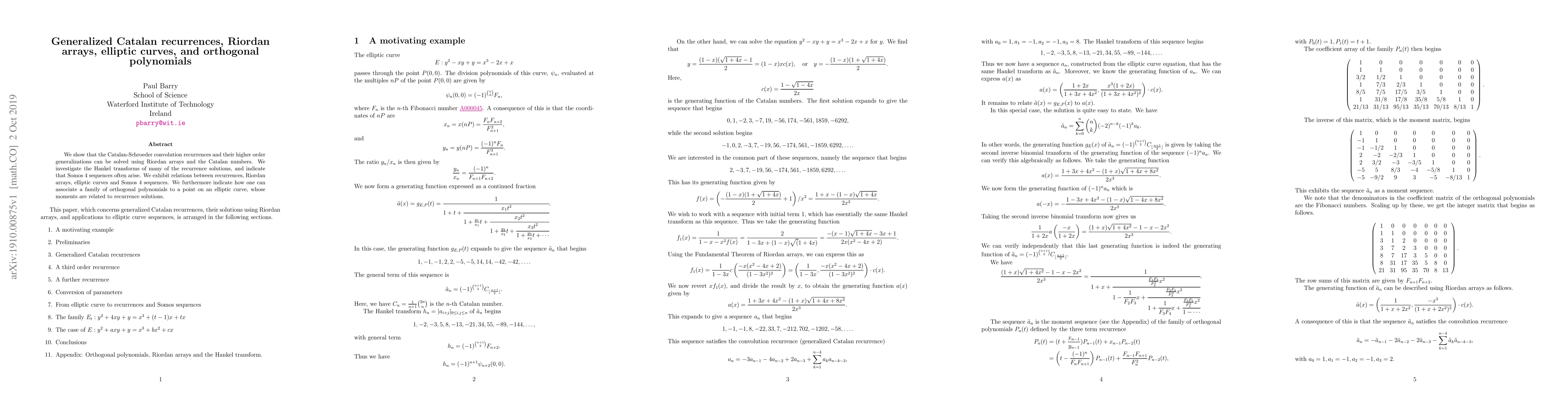 This paper solves generalized Catalan recurrences using Riordan arrays and Catalan numbers, links these solutions to Somos 4 sequences, and establishes connections between recurrences, Riordan arrays, elliptic curves, and orthogonal polynomials. It also demonstrates a relationship between moments of orthogonal polynomials and points on elliptic curves.