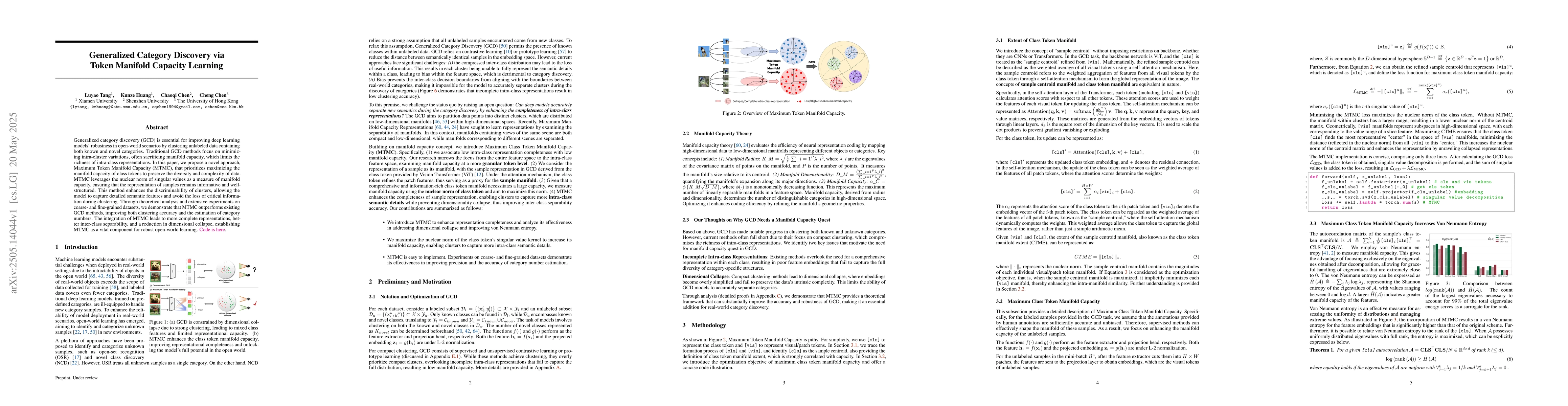 The research proposes Maximum Token Manifold Capacity (MTMC), a novel approach for Generalized Category Discovery (GCD) that maximizes the manifold capacity of class tokens to preserve data diversity and complexity, using the nuclear norm of singular values as a measure.