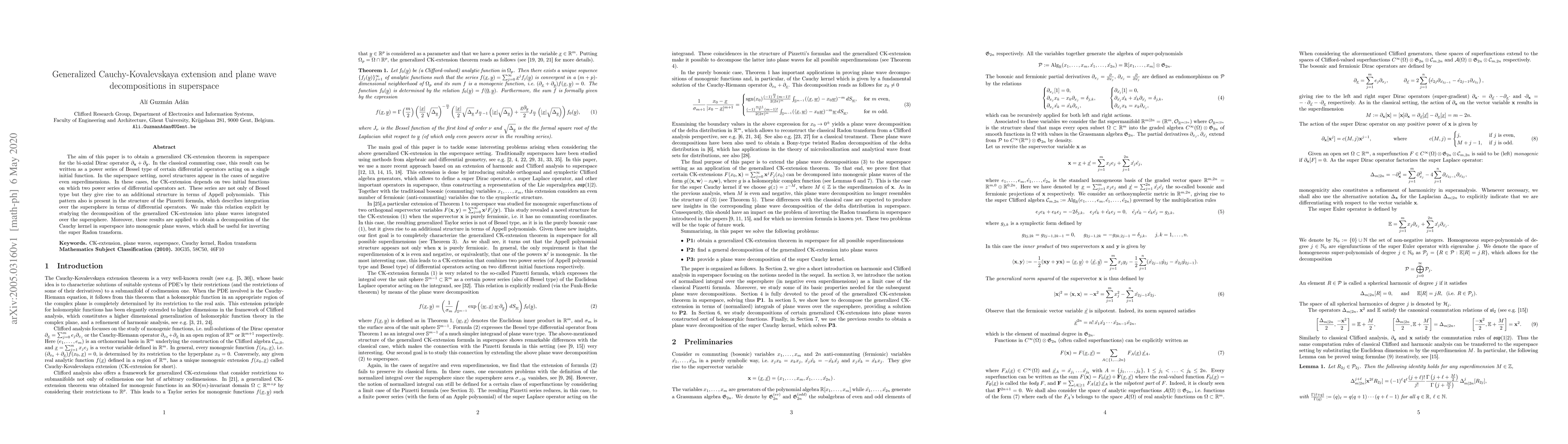 The aim of this paper is to obtain a generalized CK-extension theorem in superspace for the bi-axial Dirac operator. In the classical commuting case, this result can be written as a power series of Bessel type of certain differential operators acting on a single initial function. In the superspace setting, novel structures appear in the cases of negative even superdimensions. In these cases, the CK-extension depends on two initial functions on which two power series of differential operators act. These series are not only of Bessel type but they give rise to an additional structure in terms of Appell polynomials. This pattern also is present in the structure of the Pizzetti formula, which describes integration over the supersphere in terms of differential operators. We make this relation explicit by studying the decomposition of the generalized CK-extension into plane waves integrated over the supersphere. Moreover, these results are applied to obtain a decomposition of the Cauchy kernel in superspace into monogenic plane waves, which shall be useful for inverting the super Radon transform.