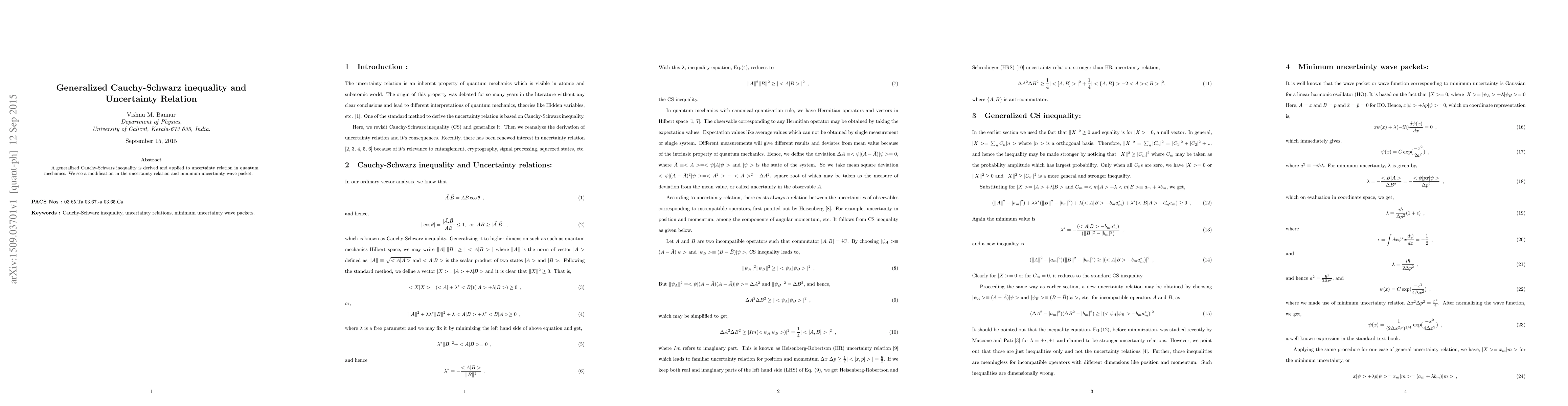 Summary: This paper derives a generalized Cauchy-Schwarz inequality and applies it to quantum mechanics, resulting in a modified uncertainty relation and a new minimum uncertainty wave packet. The new approach provides deeper insights into quantum uncertainty principles.