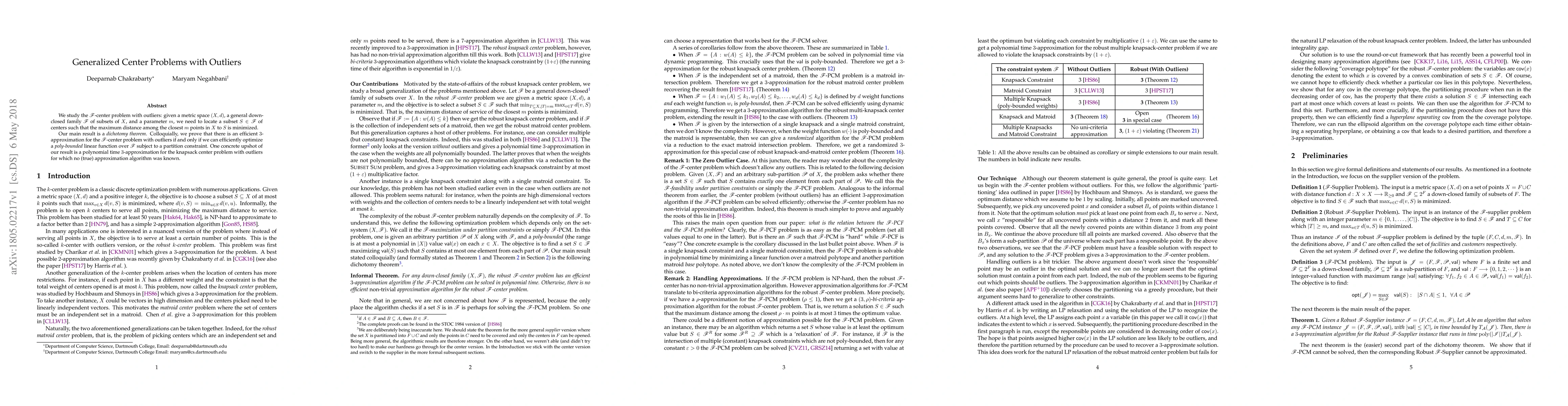 We study the $\mathcal{F}$-center problem with outliers: given a metric space $(X,d)$, a general down-closed family $\mathcal{F}$ of subsets of $X$, and a parameter $m$, we need to locate a subset $S\in \mathcal{F}$ of centers such that the maximum distance among the closest $m$ points in $X$ to $S$ is minimized. Our main result is a dichotomy theorem. Colloquially, we prove that there is an efficient $3$-approximation for the $\mathcal{F}$-center problem with outliers if and only if we can efficiently optimize a poly-bounded linear function over $\mathcal{F}$ subject to a partition constraint. One concrete upshot of our result is a polynomial time $3$-approximation for the knapsack center problem with outliers for which no (true) approximation algorithm was known.