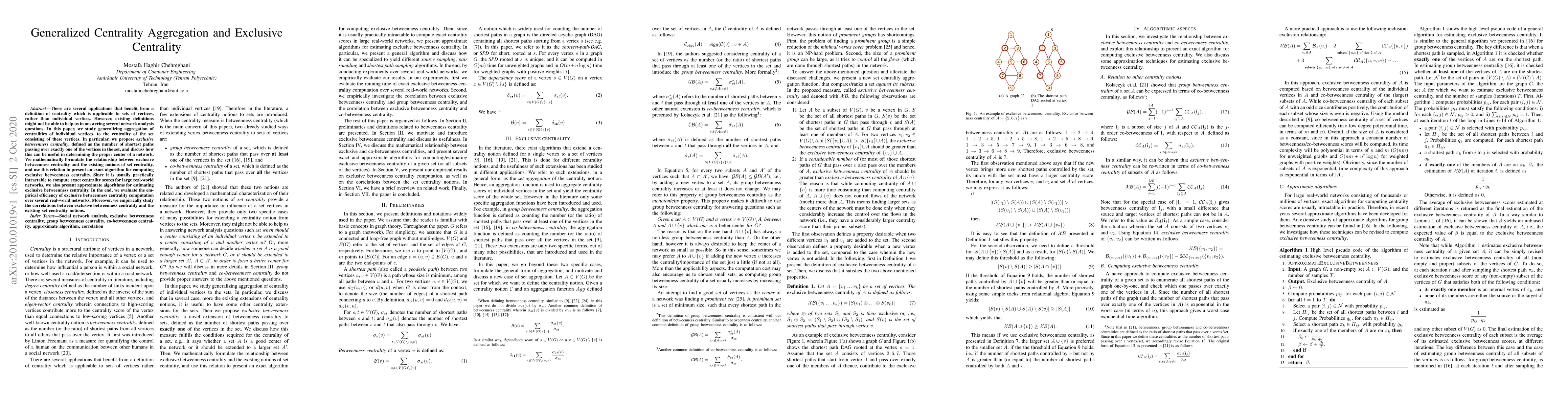 There are several applications that benefit from a definition of centrality which is applicable to sets of vertices, rather than individual vertices. However, existing definitions might not be able to help us in answering several network analysis questions. In this paper, we study generalizing aggregation of centralities of individual vertices, to the centrality of the set consisting of these vertices. In particular, we propose exclusive betweenness centrality, defined as the number of shortest paths passing over exactly one of the vertices in the set, and discuss how this can be useful in determining the proper center of a network. We mathematically formulate the relationship between exclusive betweenness centrality and the existing notions of set centrality, and use this relation to present an exact algorithm for computing exclusive betweenness centrality. Since it is usually practically intractable to compute exact centrality scores for large real-world networks, we also present approximate algorithms for estimating exclusive betweenness centrality. In the end, we evaluate the empirical efficiency of exclusive betweenness centrality computation over several real-world networks. Moreover, we empirically study the correlations between exclusive betweenness centrality and the existing set centrality notions.