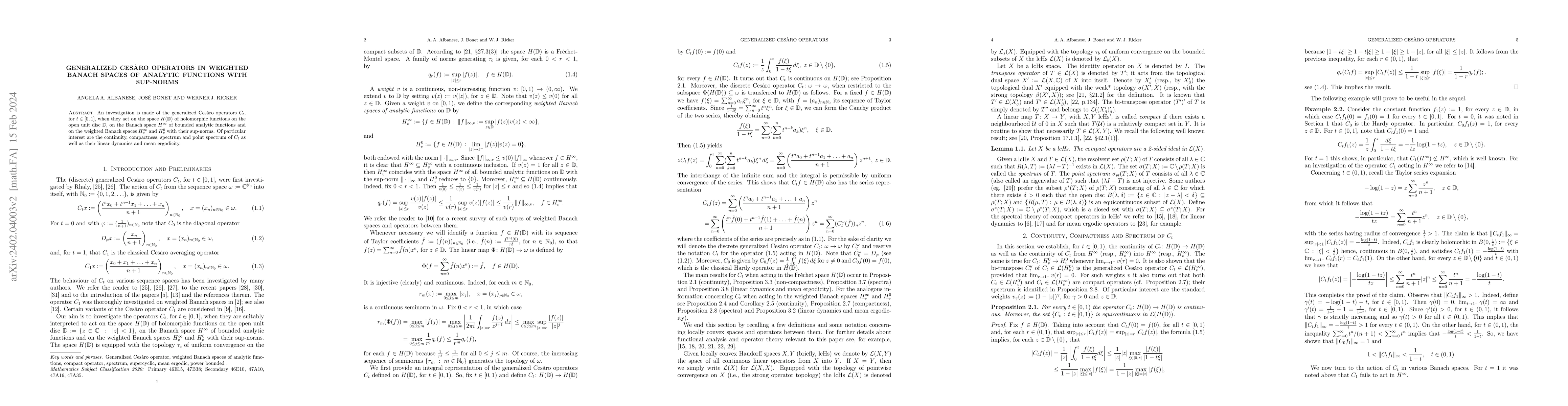 An investigation is made of the generalized Ces\`aro operators $C_t$, for $t\in [0,1]$, when they act on the space $H(\mathbb{D})$ of holomorphic functions on the open unit disc $\mathbb{D}$, on the Banach space $H^\infty$ of bounded analytic functions and on the weighted Banach spaces $H_v^\infty$ and $H_v^0$ with their sup-norms. Of particular interest are the continuity, compactness, spectrum and point spectrum of $C_t$ as well as their linear dynamics and mean ergodicity.