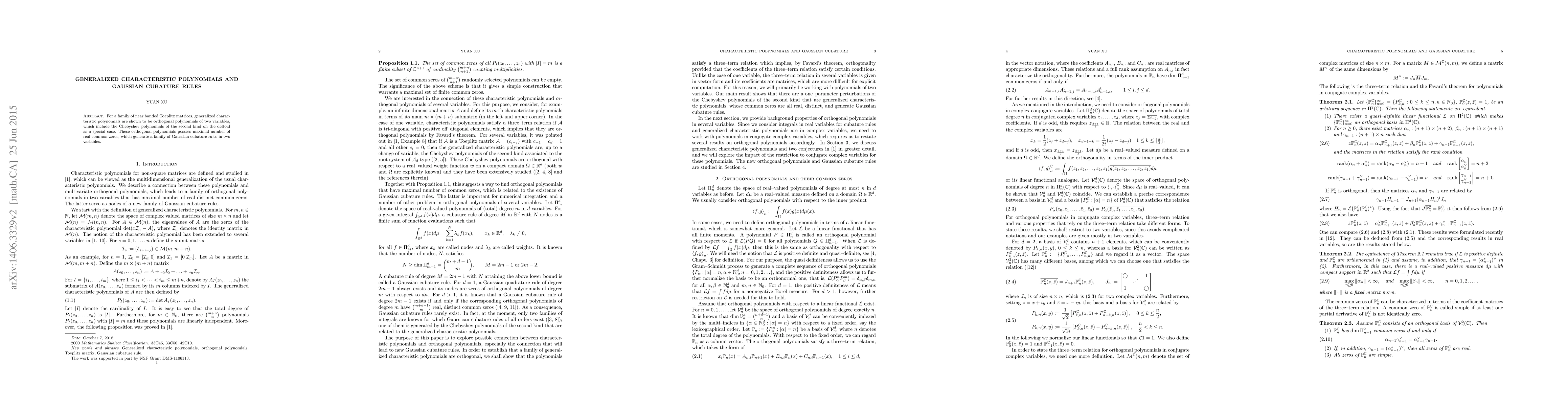 This paper demonstrates that generalized characteristic polynomials for near banded Toeplitz matrices correspond to orthogonal polynomials of two variables, including a special case of Chebyshev polynomials. These polynomials enable the derivation of a family of two-variable Gaussian cubature rules.